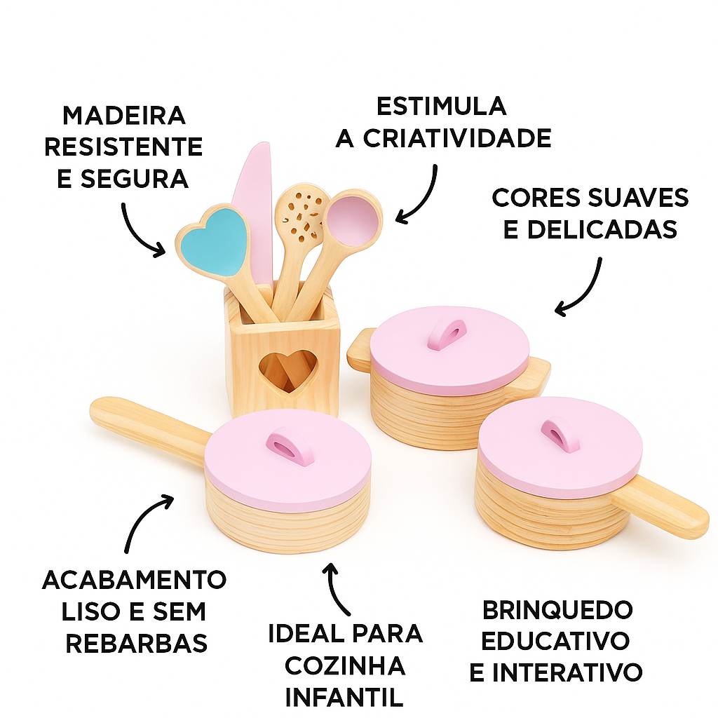 Kit Panelinhas e Utensílios de Cozinha Infantil em Madeira Rosa Brinquedo Educativo