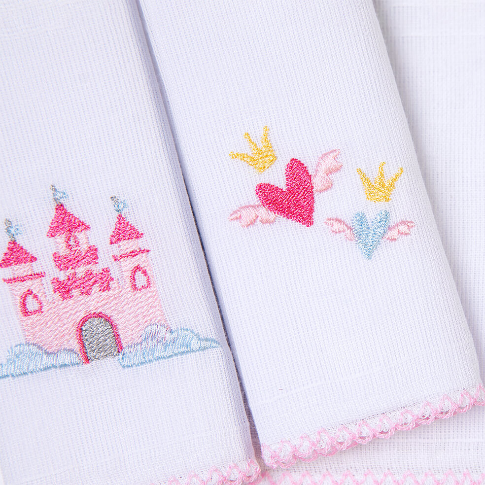 Kit Pano De Boca Bordados Papi Castelo - 3 Peças O Kit Pano de Boca Bordados Papi oferece praticidade e charme para os cuidados diários com o seu bebê. Composto por 3 unidades, cada pano de boca é confeccionado em 100% algodão, proporcionando suavidade e conforto para a pele delicada do bebê. O acabamento de picueta em um dos lados adiciona um toque de delicadeza, enquanto o bordado personalizado confere um charme especial a cada peça. Além de sua função principal para higiene, os panos de boca bordados podem ser utilizados como peças decorativas no enxoval do bebê ou como pequenos paninhos de apoio durante a amamentação. Informações Adicionais:Tamanho: Único Cor: Rosa Referência: 1552-4025 Medidas aproximadas: 32cm x 32cm Marca: Bordados Papi