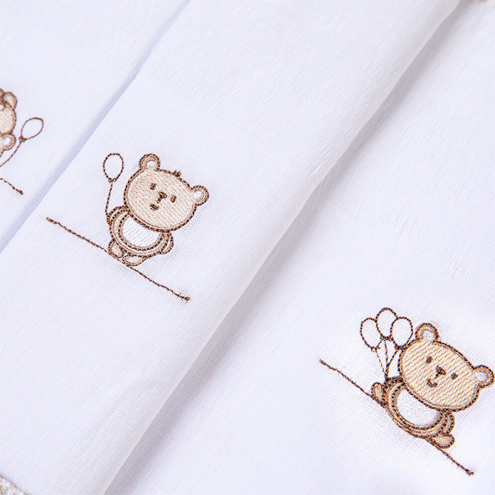 Kit Pano De Boca Bordados Papi Ted Balão - 3 Peças O Kit Pano de Boca Bordados Papi é uma opção encantadora e prática para cuidar do seu bebê. Composto por 3 unidades, cada pano é confeccionado em 100% algodão, proporcionando suavidade ao toque e conforto para a pele sensível do bebê. O acabamento de picueta nos 4 lados adiciona um toque de charme e delicadeza. Cada pano é delicadamente bordado, acrescentando um toque personalizado ao conjunto. Além de sua função tradicional de cuidados com o bebê, esses panos de boca bordados podem ser utilizados como peças decorativas no enxoval ou como pequenos paninhos de apoio durante a amamentação. Informações Adicionais:Tamanho: Único Cor: Bege Referência: 1524-4005 Medidas aproximadas: 40cm x 40cm Marca: Bordados Papi
