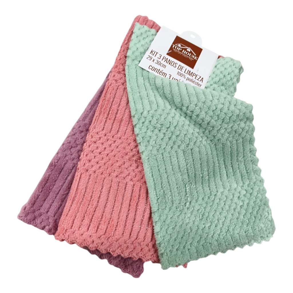 Kit Pano Microfibra Limpeza Multiuso 29x30cm Superabsorvente - 3 Unidades