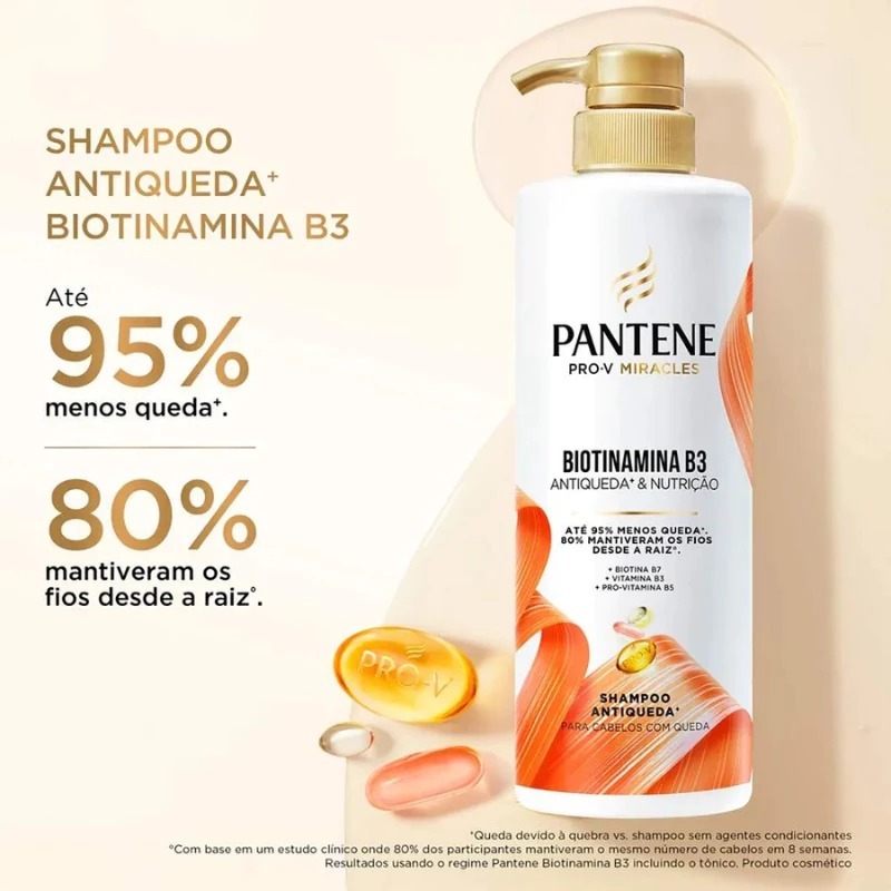Esse kit contém: 1 shampoo Pantene 510ml Pump Biotinamina B3 e 1 condicionador Pantene 510ml Biotinamina. Descrição O Shampoo Pantene Biotinamina B3 510ml com pump é ideal para quem busca cabelos mais fortes, nutridos e com menos queda por quebra*. Sua fórmula exclusiva é enriquecida com um complexo multivitamínico poderoso: Biotina B7, Vitamina B3 e Pró-Vitamina B5. Juntas, essas vitaminas fortalecem os fios desde a raiz°, proporcionando hidratação, brilho e uma limpeza suave e eficaz. O Condicionador Pantene Biotinamina B3 510ml é a escolha ideal para cabelos fracos, quebradiços e com tendência à queda. Sua fórmula avançada combina Biotina B7, Vitamina B3 e Pró-Vitamina B5, proporcionando nutrição profunda e fortalecimento dos fios desde a raiz até as pontas. Desenvolvido para reduzir a queda capilar por quebra em até 95%*, hidrata intensamente e melhora visivelmente a saúde dos cabelos.