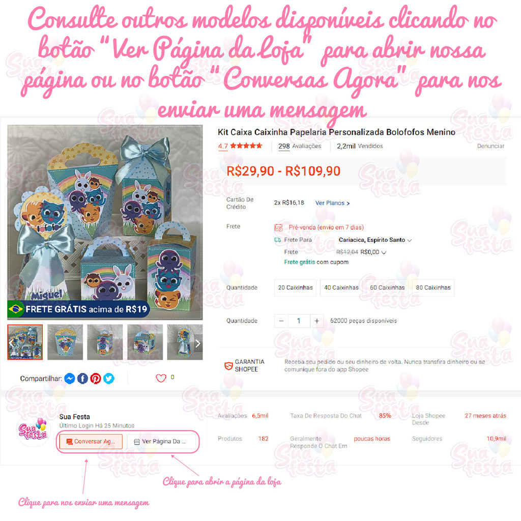 *** Leia toda a descrição do anúncio! *** A PARTIR DO DIA 12/01/2025, TODOS OS KITS NÃO IRÃO MAIS COM PEDRAS, FITAS DE CETIM E RABO DE RABO!!! AS PEDRAS E FITAS EXIBIDAS NAS FOTOS DO ANÚNCIO SÃO MERAMENTE ILUSTRATIVAS! FAVOR INFORMAR NOME, IDADE NAS OBSERVAÇÕES DO PEDIDO OU NO CHAT IMEDIATAMENTE APÓS A COMPRA!!! CASO NÃO SEJA INFORMADO EM ATÉ 24H APÓS A COMPRA, ENVIAREMOS SEM NOME, IDADE!!! *** OS MODELOS DISPONÍVEIS SÃO OS DA FOTO DO ANÚNCIO DO TEMA! ENVIAMOS A QUANTIDADE COMPRADA DIVIDIDO PELOS MODELOS DISPONÍVEIS DA FOTO DO ANÚNCIO*** Kit tradicional: Caixas com aplique 1 aplique 3d por caixa Personalizada com nome e idade da criança. Feito em papel offset 180g (grosso) em alta resolução. As caixinhas vão com 1 aplique por caixinha, sem laços, sem pedras, sem rabo de rabo e sem qualquer outro tipo de acessório que esteja nas fotos do anúncio! ELAS SÃO ENVIADAS DESMONTADAS, VOCÊ PRECISARÁ DESTACAR AS CAIXINHAS E OS APLIQUES, COLAR AS CAIXINHAS, OS APLIQUES E MONTAR OS LAÇOS. As caixinhas e os apliques são enviados cortados mas sem destacar da folha, estão cortados mas não estão soltos, é só puxar que solta. Enviamos assim para que não amasse durante o transporte. Caso tenha dificuldade na montagem das caixinhas, nos chame no chat que auxiliaremos você com instruções e vídeos. FAZEMOS OUTROS TEMAS, VOCÊ PODE CONSULTAR A DISPONIBILIDADE CLICANDO NO BOTÃO CONTATAR VENDEDOR PARA NOS ENVIAR UMA MENSAGEM. Link da nossa loja aqui na Shopee: https://shopee.com.br/suafesta - Prazo de confecção 3 a 7 dias úteis / Entrega via transportadora, verifique a data de entrega antes de finalizar o pedido. - Encomende sempre com antecedência, se atente a data do aniversário, não adiantamos envios. - Não alteramos as artes, não alteramos cores ou personagens. - As caixas são confeccionadas em papel offset 180g com acabamento FOSCO, a impressão é em alta qualidade e com recorte eletrônico. - A caixa é enviada DESMONTADA, será necessário colar as caixinhas! - Não enviamos prévia da arte para aprovação. - Enviar nome e idade após a compra para personalização via chat ou mensagem do pedido. Em caso de não envio nas 24h após a compra, será enviado sem personalização. ATENÇÃO: Não garantimos fidelidade de cores. As cores podem sofrer variações devido à qualidade e configuração de monitor para monitor ou tela de celular."