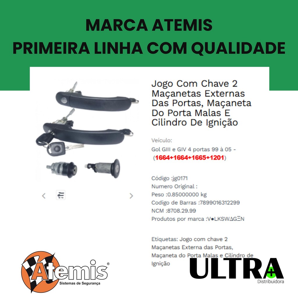Kit Par Maçaneta Externa Porta + Cilindro Porta Malas + Cilindro Ignição para VW Volkswagen Gol / Parati - 4 Portas - G3 / G4 - Mesma Chave (Atemis JG0171) Aplicação compatível: - Compatível com Gol G2 G3 G4 4 Portas Parati G3 G4 4 Portas O que acompanha 02 Maçaneta com chave 01 Miolo Porta Malas 01 Cilindro Ignição 01 Par de chaves Snake Key ( Pantografica ) ( Mesmo Segredo ) Fabricante - Atemis Código Fabricante - JG0171 Códigos Correlativos / Compatíveis: - Outros diferenciais Original Atemis Sem Rebarba Primeira linha Kit com Mesmo Segredo / Mesma Chave - Peças não genuínas / originais da montadora. As informações de linha e códigos originais aqui na Ultra Distribuidora são fornecidas apenas como referência para facilitar e garantir a escolha certa do produto para seu veículo. Códigos originais mencionados apenas como referencial para informar a similaridade com a aplicação da peça com o mesmo.