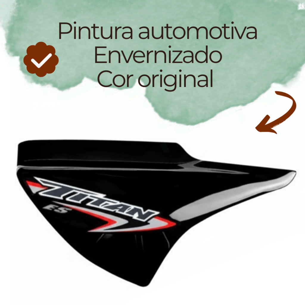 Carenagem Par Tampas Laterais – Honda CG Titan 150 (2004 até 2008) | Preto com Adesivos | Brilho Envernizado Renove o visual da sua Honda Titan 150 com este par de tampas laterais pretas com adesivos originais aplicados. Pintura automotiva de alto brilho envernizado, garantindo acabamento premium e encaixe perfeito no padrão original Honda. ✔️ Compatível com: Honda CG Titan 150 – anos 2004 a 2008 ✔️ Características: Cor: Preto com brilho envernizado Inclui adesivos originais aplicados Encaixe original, sem adaptações Material: plástico reforçado de alta resistência