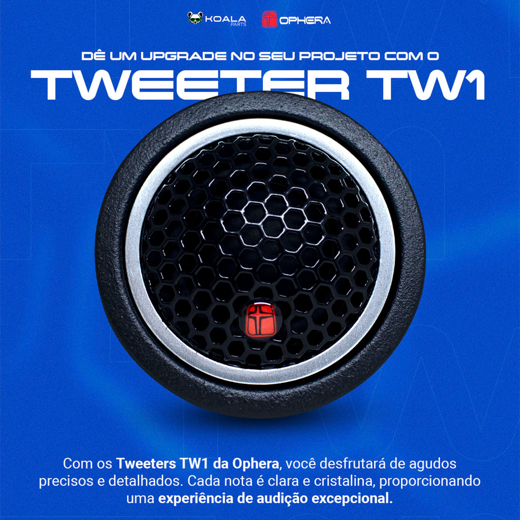 Par Mini Tweeter TW1 Domo de Seda 25mm 70W RMS Ophera >> Acompanha Suporte Direcional e Crossover Agudos limpos, claros e com presença real! Com o par de TW1 da Ophera, seu projeto ganha definição nas altas frequências e um visual moderno que combina com qualquer set. Com domo de seda de 25mm, imã de neodímio e crossover Hi-Pass a 3.5kHz, esse tweeter entrega agudos precisos, cristalinos e sem distorção — mesmo no volume alto. - Domo de seda de 25mm - Potência real de 70W (120W máx.) - Imã de neodímio - Crossover Hi-Pass 3.5kHz incluso - Sensibilidade de 91dB/w/m - Resposta de frequência: 3kHz a 22kHz - Impedância: 4 Ohms KIT COMPLETO Acompanha suporte direcional elegante e compacto, ideal pra instalar nas colunas ou no painel do carro — ampliando a sensação de espacialidade e detalhamento sonoro. Dica de Instalação: Instalando o tweeter no ângulo correto (em direção ao seu ouvido), melhora a sua experiencia de áudio, tornando-a mais envolvente. Leve mais definição pro seu som com o Tweeter TW1 da Ophera. Enviamos bem embalado, super rápido e com garantia de originalidade. Garanta o seu e confira os outros produtos da nossa Loja Koala Parts. Especificações Técnicas: Tamanho do domo: Ø 38mm Material Tweeter: Domo de seda Material do Imã: Imã de neodímio Asv Bobina de Voz: Ø 25 mm Resposta de Frequência: 3000 ~ 22000 Hz Sensibilidade: 91 dB/w/m Impedância: 4O Potência Real: 70W Potência Máxima: 120W Crossover Hi-Pass recomendado: 3.5 KHz Conteúdo da Embalagem: 1 Par Tweeter Tw1 1 Par Suporte Direcionável 1 Par Crossover Hi-Pass