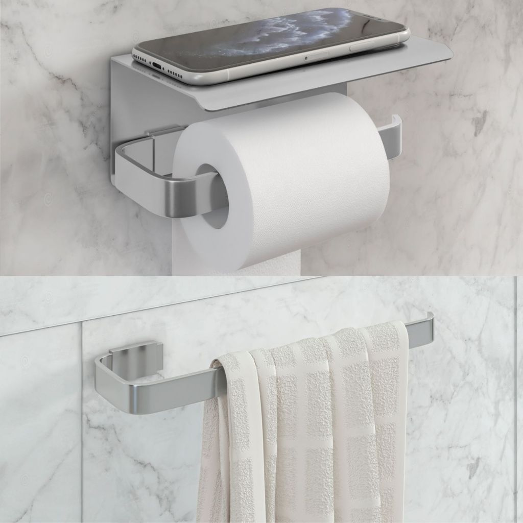 Kit Para Banheiro Suporte Papel Higienico Com Porta Celular e Porta Toalha de Rosto Contém no Kit: 1 x Porta Papel Higienico Stander com Porta Celular 1 x Porta Toalha de Rosto Linha Stander Acompanha buchas e parafusos para fixação na parede Produto em barra maciça de aluminio com acabamento da canopla em inox Pintura Eletrostatica