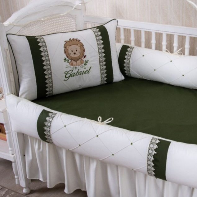 KIT PARA BERÇO BEBÊ 519 LEÃOZINHO PALHA/VERDE PERSONALIZAMOS COM NOME DO SEU BEBÊ -COMSAIA DE BERÇO