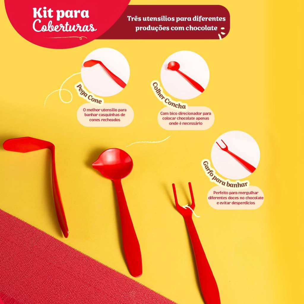 A maior caçadora de tendências se juntou à maior empresa que cria tendências na confeitaria. E juntas criaram a Linha Tábata Romero + BlueStar. O Kit para Coberturas da Linha Tábata Romero traz 03 (três) utensílios para diferentes produções com chocolate. O puro suco da praticidade! O Kit acompanha: - 01 (uma) Colher Concha - com bico direcionador para colocar chocolate apenas onde é necessário; - 01 (um) Pega Cone - o melhor utensílio para banhar casquinhas de cones recheados; - 01 (um) Garfo para banhar - perfeito para mergulhar diferentes doces no chocolate e evitar desperdícios. Informações adicionais: Quantidade peças: 3 Cor: Vermelho Suporta temperaturas de até 80°C. *Todas as informações são de responsabilidade do fabricante/fornecedor. *Imagens meramente ilustrativas.