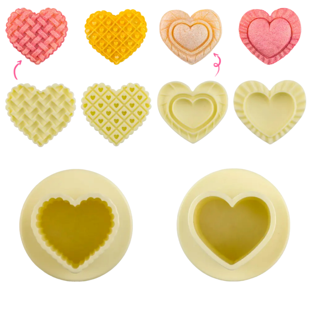 MOLDE PARA EJETOR MAX CORAÇÕES BABADOS Kit para Ejetores Max - Para modelar doces e massas com efeito 3D! Os Ejetores Max da Blu foram desenvolvidos pensando em modelagens em alto relevo, que trazem mais sofisticação para doces e massas Ideais para *brigadeiros, pasta americana, massa de leite em pó* e muito mais! Com ele é possível modelar um doce inteiro de até *25g* ou fazer apliques fininhos para compor a decoração NÃO ACOMPANHA O EJETOR! SOMENTE OS MOLDES. * EJETOR VENDIDO SEPARADAMENTE*