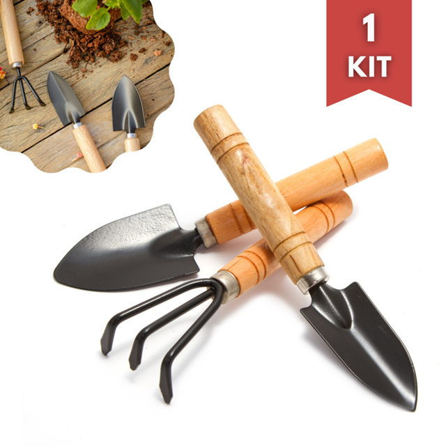 Kit para jardinagem contendo 3 lindas peças com cabo de madeira ferramenta jardim planta decoração