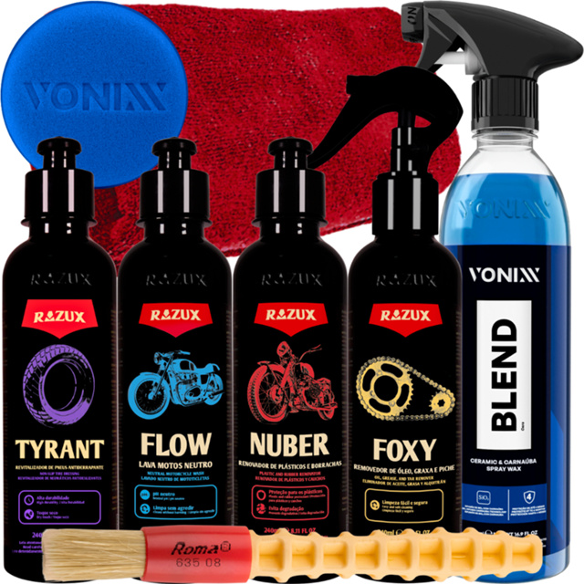 KIT CONTÉM: BLEND SPRAY 500ML - CERA LIQUIDA FLOW 240ML - SHAMPOO NEUTRO NUBER 240ML - REVITALIZADOR DE PLÁSTICOS TYRANT 240ML - PNEU PRETINHO ANTI-DERRAPANTE FOXY 240ML - DESENGRAXANTE PANO 40X40CM PINCEL ROMA APLICADOR DE ESPUMA VONIXX ---------------------------------------------------------------------------- BLEND CERAMIC SPRAY WAX 500ML - CERA LÍQUIDA COM SIO2 E CARNAÚBA DESCRIÇÃO: Blend Ceramic & Carnaúba Spray Wax é uma cera híbrida, composta por SiO2 e pela mais pura carnaúba tipo 1 e que protege a superfície veicular por até quatro meses. O produto promove a resistência cerâmica, brilho quente da carnaúba e hidrorrepelência. DURABILIDADE: Até quatro meses de durabilidade MODO DE USO: 1. Agite bem o produto antes de usar 2. Após lavar o veículo, pulverize uma pequena quantidade do produto na pintura. Mantenha uma distancia de 20 cm em uma área não superior à 60 cm x 60 cm 3. Sem deixar secar, realize o acabamento utilizando toalha de microfibra limpa e seca, até obter o brilho desejado 4. Continue fazendo o processo até a conclusão total do veículo Obs: Em caso de manchas, aplicar novamente o produto. ---------------------------------------------------------------------------- FLOW LAVA MOTOS NEUTRO RAZUX 240ML DESCRIÇÃO: Fórmula concentrada de pH neutro, com excelente nível de lubrificação para realizar uma lavagem segura e de alto nível. MODO DE USO: - Dilua 10 a 20 ml do produto em 5 litros de água. - Mergulhe a luva de lavagem na solução e inicie o processo de esfregação suavemente. - Em seguida faça o enxágue para a retirada do produto. - Utilize uma toalha de secagem para finalizar o processo. ---------------------------------------------------------------------------- TYRANT 240ML - REVITALIZADOR DE PNEUS ANTIDERRAPANTE RAZUX DESCRIÇÃO: Tyrant é um revitalizador de pneus atiderrapante para motocicletas. Forma um filme seco, sem deixar com o aspecto pegajoso. Deixa o pneu com aspecto de novo, não sai com água e possui durabilidade de até 60 dias. Proporciona tranquilidade e segurança aos motociclistas MODO DE USO: 1. Limpar bem a superfície e em seguida aplicar o produto com um aplicador de espuma até a completa revitalização 2. Se necessário repetir a operação. ---------------------------------------------------------------------------- NUBER RENOVADOR DE PLÁSTICOS E BORRACHAS 240ML RAZUX DESCRIÇÃO: Desenvolvido para renovar e proteger plásticos e borrachas de motocicletas. MODO DE USO: - Após limpar o plástico, coloque algumas gotas do produto em um aplicador de espuma. - Espalhe o produto de maneira uniforme e faça acabamento até a uniformidade total. ---------------------------------------------------------------------------- FOXY REMOVEDOR DE ÓLEO, GRAXA E PICHE 240ML RAZUX DESCRIÇÃO: Fórmula inovadora excepcional para remoção de óleo, graxa e piche. É a maneira mais eficiente e segura para limpeza de motor, kit de transmissão, pintura e demais partes da motocicleta. MODO DE USO: - Pulverize o produto sobre superfície a ser limpa. - Com o auxílio de um pincel de detalhamento, esfregue até soltar toda sujeira. - Faça o enxágue com água. - Se necessário repita a operação.