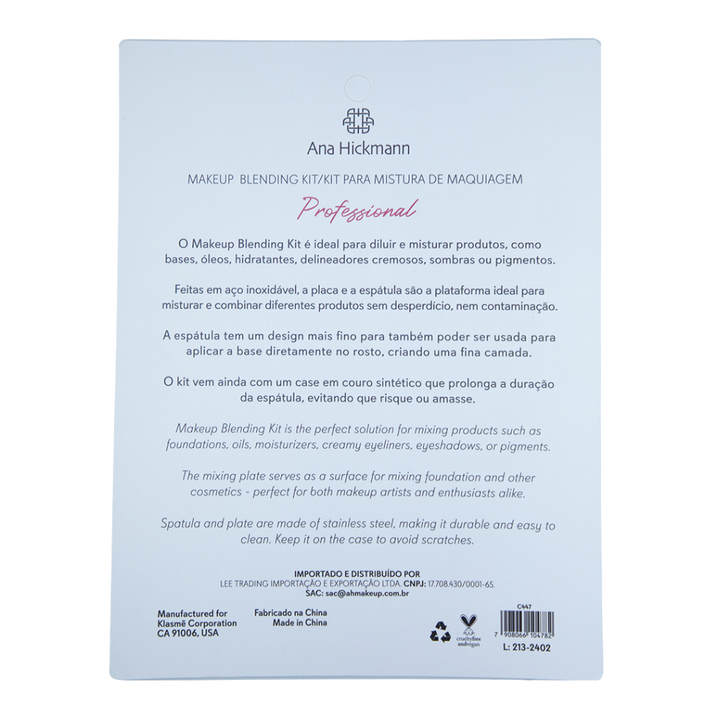 O Makeup Blending Kit é ideal para diluir e misturar produtos, como bases, óleos, hidratantes, delineadores cremosos, sombras ou pigmentos. Feitas em aço inoxidável, a placa e a espátula são a plataforma ideal para misturar e combinar diferentes produtos sem desperdício, nem contaminação. A espátula tem um design mais fino e pode ser usada para aplicar a base diretamente no rosto, criando uma fina camada. O kit vem ainda com um case em couro sintético que prolonga a duração da espátula, evitando que risque ou amasse. Placa e espatula de aço inoxidável, vem com case de couro sintético.