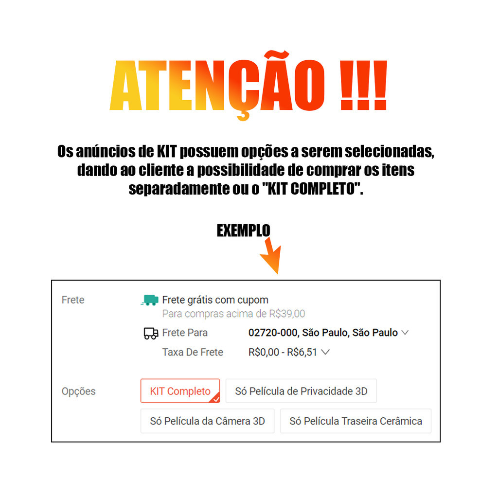 ATENÇÃO !!! Os anúncios de KIT possuem opções a serem selecionadas, dando ao cliente a possibilidade de comprar os itens separadamente ou o "KIT COMPLETO". O KIT CONTÉM: 1 Unid - Película de Privacidade 3D | Material (VIDRO TEMPERADO); 1 Unid - Capa TPU | Silicone (Transparente); 1 Unid - Película da Câmera 3D | Material (VIDRO TEMPERADO); 2 Unid - Kit de Limpeza. Compatibilidade: Modelo conforme título do anúncio. ALERTA - CASO SEU CELULAR POSSUA BIOMETRIA NA TELA, A PELICULA DE PRIVACIDADE IMPEDE A LEITURA. Gostaríamos de lhe oferecer a melhor experiência em compras por essa plataforma. Sendo assim, caso tenha alguma dúvida, não deixe de perguntar. Temos uma equipe especializada pronta a te atender. Orientamos que a aplicação do produto seja realizada por um profissional. Porém, caso deseje realizar a aplicação em casa, não nos responsabilizamos. Fotos meramente ilustrativas;
