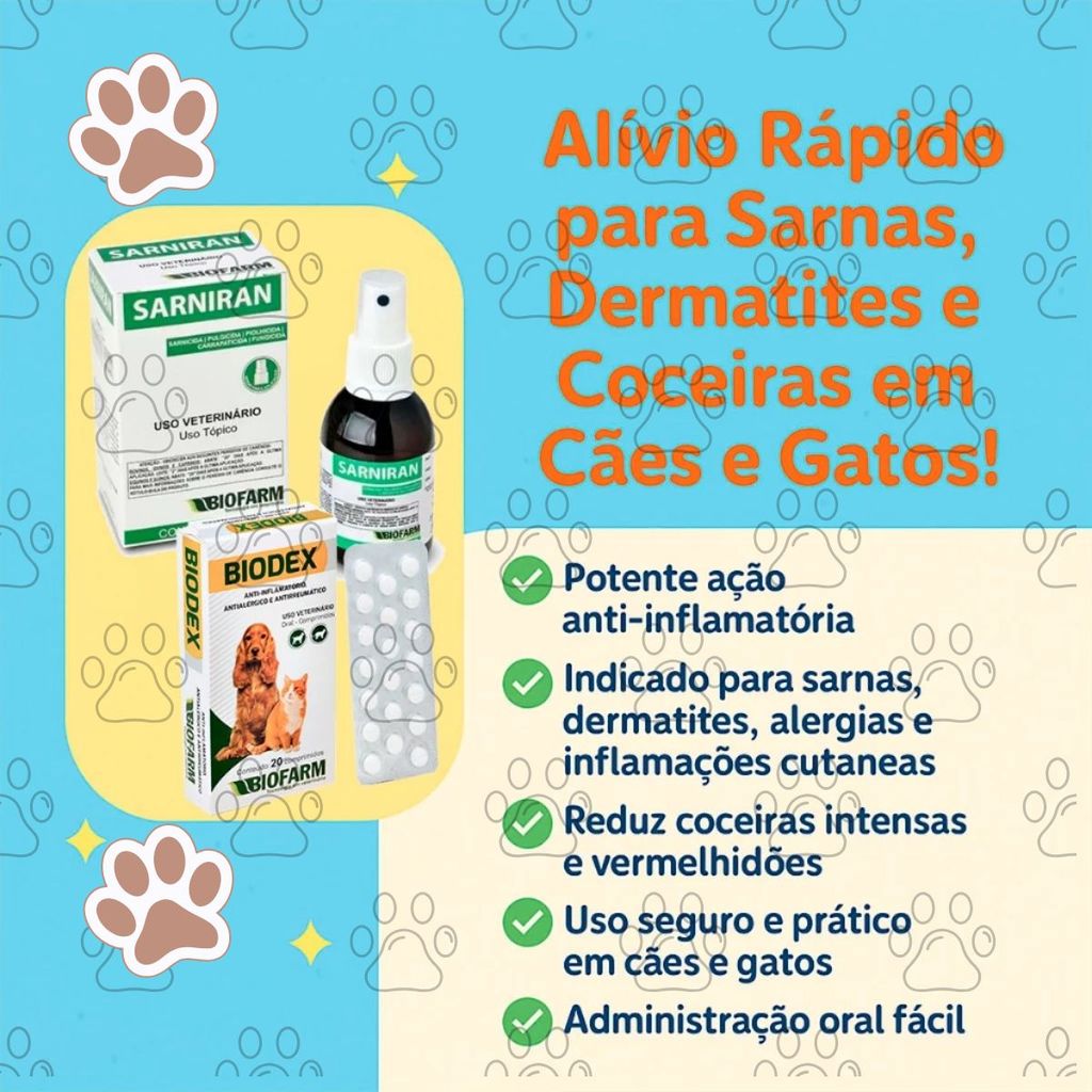 DESCRIÇÃO: Kit Tratamento Completo – Sarniran 100ml + Biodex 20 Comprimidos Combinação poderosa para tratar e proteger seu pet contra sarnas, alergias e infecções de pele! O Kit Sarniran + Biodex foi desenvolvido para oferecer um tratamento eficaz, rápido e seguro contra problemas de pele, infecções e sarnas em cães e gatos. A união desses dois produtos potencializa o resultado, promovendo melhor recuperação, alívio da coceira e regeneração da pele. - Sarniran 100ml O Sarniran é um antiparasitário tópico indicado para o tratamento das sarnas sarcóptica, demodécica e otodécica em cães e gatos. Sua fórmula age diretamente sobre os ácaros causadores da sarna, aliviando a coceira, irritação e inflamação da pele. Além disso, auxilia na regeneração dos pelos e na redução de feridas e crostas causadas pelas lesões cutâneas. - Benefícios do Sarniran: Ação rápida contra os ácaros da sarna; Alivia coceiras, vermelhidão e descamação; Ajuda na regeneração da pele e crescimento dos pelos; Indicado para cães e gatos. - Biodex 20 Comprimidos O Biodex é um antibiótico e anti-inflamatório de uso oral, indicado no tratamento de infecções de pele, ouvido, respiratórias e urinárias em cães e gatos. Sua ação sistêmica potencializa o efeito do tratamento tópico, garantindo resultado completo de dentro para fora. -Benefícios do Biodex: Combate infecções bacterianas que agravam as sarnas e dermatites; Reduz inflamação e acelera a cicatrização; Melhora o quadro clínico do pet em poucos dias; Indicado para cães e gatos sob orientação veterinária. Modo de uso: Sarniran: aplicar nas áreas afetadas, massageando levemente até completa absorção. Repetir conforme orientação do veterinário. Biodex: administrar a dose conforme peso e prescrição veterinária. ---------------------------------------------------------------------------------------------- A MANADA ANIMAL é um marketplace de produtos veterinários. É a escolha certa para tutores que prezam pela qualidade dos produtos que seu animal necessita. Tudo com o suporte de uma equipe de veterinários e gestores com mais de 10 anos de experiência no mercado. Fique tranquilo, todos os nossos produtos são originais, adquiridos através de distribuidores credenciados! Ah, e todas as vendas acompanham nota fiscal! MANADA ANIMAL, Tranquilidade pra você, cuidado para ele!