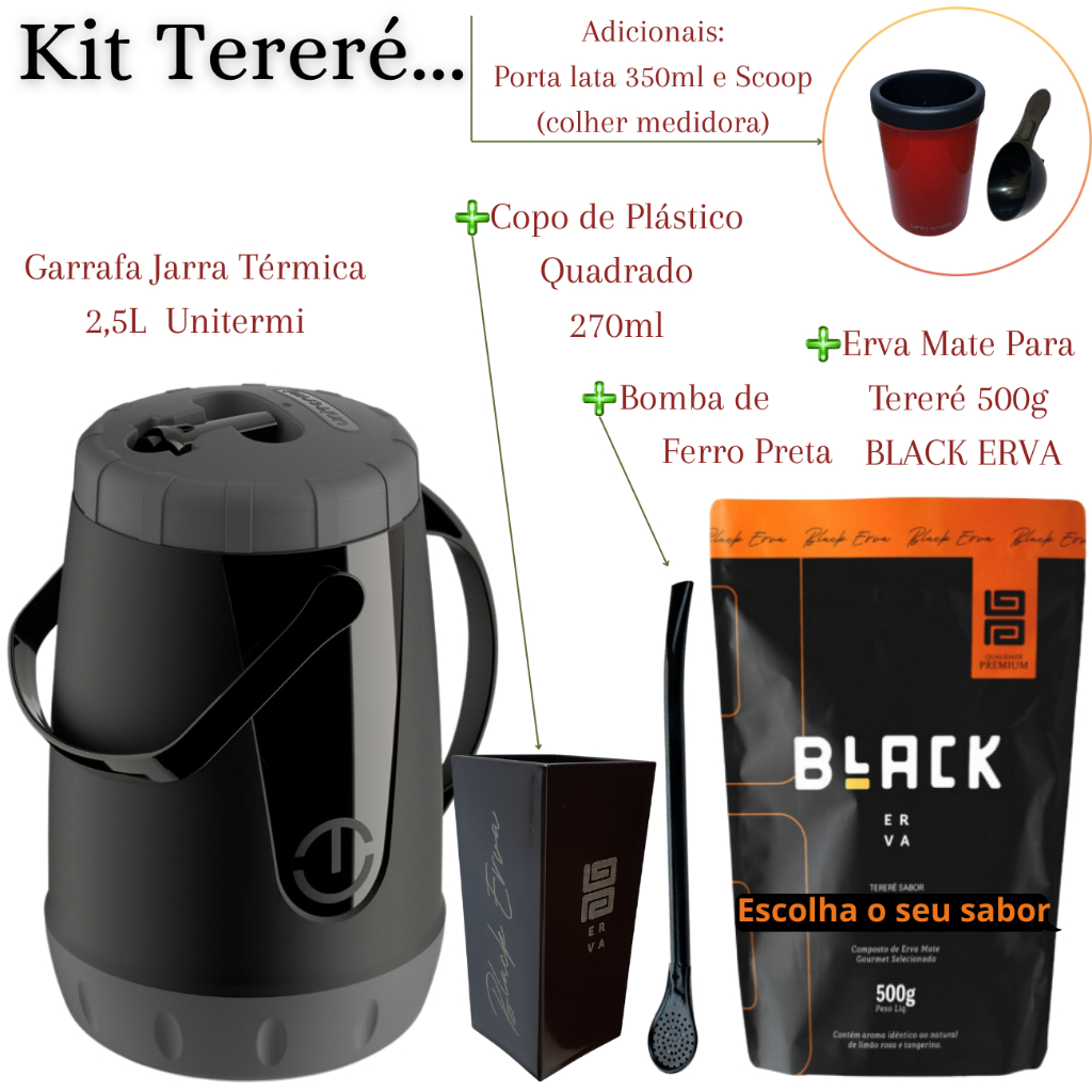 LEIA COM ATENÇÃO A DESCRIÇÃO Itens inclusos: 1 x Garrafa Térmica 2.5 Litros – Modelo Pávia Unitermi 1 x Pacote com 500g de Black Erva Mate Tereré escolha o sabor 1 x Copo quadrado Acrílico Preto de 270ml - Marca Black 1 x Bomba Clássica de ferro Preta Pintura Epóxi 1 x Porta Lata 350ML Cor Sortida + Scoop (Colher medidora) Erva Mate Black Erva Disponível em 13 sabores: Burrito Cereja Ice Double Black Energético Hortelã Ice Menta Black Menta e Boldo Menta e Limão Pura Folha Lemon Blend Menta Paraguaia Limão Caipira Abacaxi Hortelã e Gengibre Kit lindo e super MODERNO, você vai apreciar o seu mate com muito mais estilo, pois a Black Erva é o novo conceito para Tereré no Brasil, com produtos de alta QUALIDADE. Produto com acabamento IMPECÁVEL, super RESISTENTE e com alta DURABILIDADE. Não perca tempo e garanta já o seu Kit diferenciado!!!! Especificações: A Garrafa Térmica Jarra Pavia conta com um sistema de alça dupla, garantindo maior facilidade no transporte. Aliado ao tradicional bico dosador, melhorando ainda mais a forma em servir bebidas. ANTES DE QUALQUER COISA FAÇA A VERIFICAÇÃO DA GARRAFA SOMENTE COM ÁGUA. Composição: - Polipropileno com isolamento térmico em Poliuretano Capacidade: - 2,5 Litros Medidas: - Externas: 16,7 cm diâmetro x 26,2 cm altura - Internas: 12,5 cm diâmetro x 23 cm altura Copo: Material: Acrílico Capacidade: 270ml Altura: 12cm Diâmetro da boca: 5,5cm Bomba: Material – Ferro Pintura Epóxi Preta É de fácil utilização e limpeza, não acumula cheiro ou resíduos; Medidas: 19 x 2 cm. Modelo Kit Completo Tereré Black Erva Mate 500g Garrafa Térmica 2,5L Unitermi Copo Cuia Quadrado Acrílico Preto Bomba de Ferro Preta Porta Lata Cor Sortida e Scoop (Collher medidora)