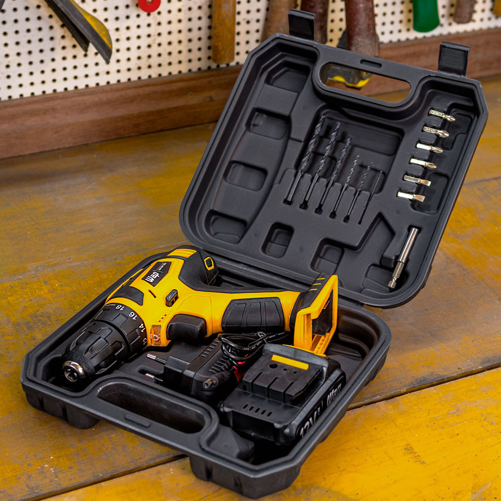 Você estará Comprando: Parafusadeira e Furadeira 12v BPF 12K3 Wap 01 Broca de Aço Rápido 1,5 mm 01 Broca de Aço Rápido 2,5 mm 01 Broca de Aço Rápido 3,0 mm 01 Broca de Aço Rápido 4 mm 01 Broca de Aço Rápido 5 mm 01 Broca de Aço Rápido 6 mm 01 Suporte Magnético de Bit 1/4 01 Pozidrive (PZ2) 01 Pozidrive (PZ1) 01 Phillips (PH2) 01 Phillips (PH1) 01 Fendas (5 mm) 01 Fendas (6 mm) 01 Maleta 01 Jogo de Ferramentas com 165 Peças Parafusadeira e furadeira 12V BPF 12K3. Pronta para usar a qualquer hora. Para quem busca praticidade e eficiência nas diversas tarefas manuais, a parafusadeira e furadeira 12V BPF 12K3 é a solução ideal. Com design exclusivo WAP, é uma ferramenta compacta, porém robusta, ideal para pequenas reformas e manutenção do lar. É bivolt e opera com bateria compacta recarregável de tecnologia lítio (Li-Íon), o que traz maior vida útil ao produto e proporciona a mobilidade de ter a ferramenta sempre a mão. Ainda conta com led indicativo de nível da bateria, que sinaliza quando é o momento de recarregar. Seja para apertar ou soltar parafusos, você tem o controle através do seletor de reverso, que inverte o sentido de rotação para o uso adequado a cada necessidade. Com seletor de torque de 18 níveis para parafusar e 1 nível para perfurar, é possível ajustar os parâmetros mais adequados para o trabalho a ser realizado. Somado ao ajuste de velocidade por pressão no gatilho, a ferramenta oferece muito mais produtividade e economia de tempo. A parafusadeira e furadeira 12V BPF 12K3 é um produto indicado para uso residencial e tem ótimo desempenho nas mais diversas tarefas. Vem com mandril de aperto rápido e design ergonômico, que garante maior conforto ao utilizar. Já o LED embutido no produto ajuda na melhor visibilidade do local de trabalho. Ainda acompanha maleta completa com acessórios para facilitar o uso com a ferramenta. Led de Iluminação Indicador de Carga de Bateria Seletor de Torque com 18 Níveis de aperto e 1 função de furação. Seletor Reverso Informações Técnicas Código: FW008649 Modelo: WAP BPF 12K3 Marca: Wap Tensão: Bivolt ( Carregador) Tipo de Bateria: Li-íon Frequência: 50 / 60 Hz Mandril: 3/8 Polegadas (10mm) Rotações: Velocidade 1: 0 - 740 Rpm Capacidade da Bateria: 1.300 mAh Tempo de Carregamento: 3 á 5 Horas Torque: 17 Nm (1,7 kgf.m) Perfuração na Madeira: 20mm Perfuração no Aço: 6mm Cor: Amarelo com Preto Dimensões Aproximada CxLxA: 21,5x6,9x19cm Peso Bruto: 1.6 Kg Dimensões da Embalagem (CxLxA): 20x7x23cm Garantia: 1 Ano Jogo de Ferramentas com 165 Peças Garantia: 90 Dias Peso: 2,4kg Composição: 01 Martelo unha 250g, cabeça 23 mm 01 Nível torpedo 9” (230 mm) 3 bolhas 01 Chave de fenda 1/4” (6,35 mm) 01 alicate de bico longo reto 5” (135mm) 01 Serrote de metal 10” (250 mm) 01 Trena 3,5m x 12mm 01 Estilete com lâmina de 9 mm comprimento (145 mm) 01 Chave teste (ponta SL3) 01 Fita Isolante (5m x 16 mm) Jogo de Soquetes 9 peças - encaixe 1/4” (5, 6, 7, 8, 9, 10, 11, 12, 13mm); Jogo com 8 chave Allen: (1,5 - 2 - 2,5 - 3 - 4 - 5 - 5,5 - 6mm); 02 chaves de precisão SL2,4 - PH 0 01 Cabo anatômico com encaixe quadrado Jogo de bits com 10 tamanhos: (Fenda 3-4-5), (Phillips 1-2-3), (Pozidriv 0-1-2), (Hex H3 - H4 - H5 - H6 mm), (Torx T10 - T15 - T20 - T25), (Quadrado S1 - S2). Peças de fixação 10 parafusos 4 x 25mm 10 buchas plásticas para fixação 4 x 25 mm 05 parafusos M4 x 0,7mm 05 porcas M4 x 0,7mm 04 ganchos de suspensão 27 mm 43 pregos de 20mm x 1,2 mm 50 abraçadeiras de nylon 100 x 2,5 mm 01 Maleta plástica