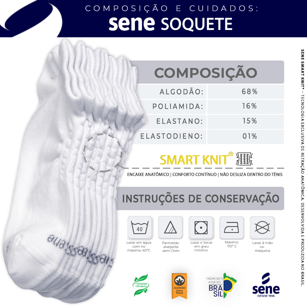 🧦 Meia Sene Soquete – Conforto, Ajuste Perfeito e Tecnologia Smart Knit® A Meia Sene Soquete foi desenvolvida para quem busca conforto real no dia a dia, com ajuste anatômico perfeito, tecido respirável e tecnologia exclusiva que impede a meia de deslizar dentro do tênis. Ideal para uso casual, trabalho, academia, caminhadas e rotina diária. Produzida no Brasil com algodão penteado de alta qualidade, que entrega maciez, durabilidade e excelente absorção de suor. ✅ PRINCIPAIS BENEFÍCIOS: ✔ Tecnologia Smart Knit® – Não desliza dentro do tênis ✔ Encaixe Anatômico – Ajuste perfeito ao pé ✔ Calcanhar Anatômico – Mais estabilidade e conforto ✔ Punho Reforçado – Não aperta e não laceia ✔ Tecido Respirável – Mantém os pés secos ✔ Costura Invisível – Mais conforto, zero atrito ✔ Algodão Penteado – Extra macio e resistente ✔ Conforto Contínuo para Uso Prolongado 🧵 COMPOSIÇÃO: - Algodão: 68% - Poliamida: 16% - Elastano: 15% - Elastodieno: 1% 📐 TAMANHOS DISPONÍVEIS: - P: 33–36 - M: 37–40 - G: 41–44 🎨 CORES DISPONÍVEIS: - Branco - Preto - Misto (Branco, Preto e Cinza) 📦 QUANTIDADES DE PARES QUE COMPÕEM O KIT: Você pode escolher entre: ✅ 3 Pares ✅ 6 Pares ✅ 12 Pares 🧼 INSTRUÇÕES DE CONSERVAÇÃO: - Lavar em água até 40ºC - Não usar alvejante com cloro - Pode lavar e secar - Passar até 110ºC - Lavar à mão ou na máquina - Não lavar a seco BR Produção Nacional ✔ Produto Fabricado no Brasil ✔ Sene – Desde 1995 - Tradição, qualidade e tecnologia em cada detalhe.