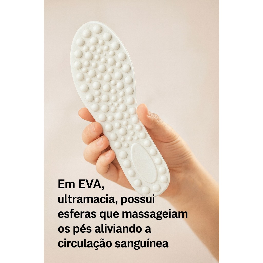 PALMILHA ORTOPÉDICA ANATÔMICA PARA ESPORÃO E FASCITE PLANTAR – CONFORTO E MASSAGEM PARA SEUS PÉS Se você sente dores nos pés, sofre com esporão de calcâneo ou fascite plantar, essa palmilha ortopédica é a solução perfeita para aliviar o desconforto do dia a dia! Desenvolvida com esferas massageadoras que estimulam a circulação sanguínea, ela reduz tensões, alivia dores e oferece conforto prolongado, ideal para quem passa muitas horas em pé ou usa sapatos fechados. Benefícios da Palmilha Ortopédica: Alívio imediato para esporão e fascite plantar; Esferas macias que massageiam e reduzem o cansaço dos pés; Auxilia na circulação sanguínea e relaxamento; Confortável para uso diário em tênis, sapatos e botas; Unissex, disponível do tamanho 33/34 ao 39/40. Características do Produto: 1 par de palmilhas ortopédicas anatômicas; Produzidas em EVA de alta qualidade, leve e resistente; Fácil de higienizar (lavável e secagem rápida); Cores disponíveis: preto, branco ou bege (enviadas conforme disponibilidade de estoque); Sem contraindicações. Tabela de Tamanhos Para escolher o tamanho ideal, meça o comprimento do pé com uma régua: Nº 33/34 – 22,5 cm Nº 35/36 – 23,5 cm Nº 37/38 – 24,5 cm Nº 39/40 – 26,0 cm Cuidados para Maior Durabilidade: Evite uso prolongado em locais com água; Não utilizar durante o banho; Lave à mão e seque à sombra; Evite contato com lama, terra ou locais úmidos. Atendimento e Envio: Pronta entrega com postagem em até 24h úteis; Envio seguro para todo Brasil; Atendimento de segunda a sexta, das 7h às 17h. Dúvidas Frequentes: Para comprar mais de um modelo, adicione cada um ao carrinho antes de finalizar a compra. Não é possível alterar o endereço após a confirmação do pagamento. Pagamentos via boleto podem levar até 3 dias úteis para compensação. Por que escolher a nossa palmilha ortopédica? Com design anatômico e efeito massageador, ela não só alivia dores, mas também oferece conforto e bem-estar ao longo do dia. É ideal para quem busca qualidade e durabilidade a um preço acessível.
