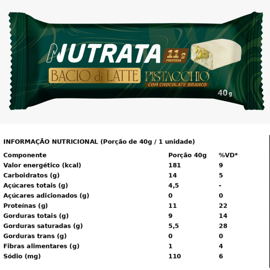 Display Barra de Proteína com 12 un – Pistacchio Bacio di Latte 40g | Nutrata A sua proteína com sabor gourmet agora em um display com 12 unidades! Aproveite o legítimo sabor do Pistacchio Bacio di Latte com a cremosidade do Whey Grego em uma barra prática, nutritiva e irresistível! Ideal para o dia a dia, treinos ou lanches saudáveis. Pistacchio com chocolate branco; 11g de proteína por barra; Zero glúten e com textura cremosa com Whey Grego. ------------------ Benefícios: ------------------ Alto teor de proteína para auxiliar na recuperação e ganho de massa muscular; Opção saudável e saborosa para substituir doces e lanches calóricos; Pronto para levar na bolsa, mochila ou lancheira. -------------------------------------------------------------------------------------------------------------------------------------------------------- SABOR, ENERGIA E PROTEINA EM CADA PORÇÃO Pasta de amendoim com whey protein de alta qualidade, sem adição de açúcar, textura leve e cremosa, pedaços crocantes e sabor irresistível. Deliciosa como só a Nutrata consegue fazer! ------------------------ DIFERENCIAIS ------------------------ Sabores incríveis; Pedaços crocantes; Textura leve; Com whey protein; Sem adição de açúcar; 0 gordura trans; Livre de acessulfame de potássio. -------------------------------------------------------------------------------- COMO USAR A PASTA DE AMENDOIM NUTRATA? -------------------------------------------------------------------------------- Enriqueça o sabor de pães e torradas; Adoce suas frutas com muita cremosidade; Experimente pura para dar energia ou matar a vontade de um docinho. ------------------------------------------------------------------------------------ QUANDO USAR A PASTA DE AMENDOIM NUTRATA? ------------------------------------------------------------------------------------ No café da manhã, para começar o dia com mais sabor e disposição; No meio da tarde, para um lanche delicioso e proteico; Antes do treino, para dar aquele gás a mais; Sempre que der vontade de comer algo gostoso e nutritivo. -------------------------- INGREDIENTES: -------------------------- Amendoim torrado, creme sabor chocolate branco (gordura ve-getal, soro de leite em pó, leite em pó desnatado, leite em pó integral, manter-ga de cacau, edulcorante maltitol, emulsificante lecitina de soja, estabilizanie poliglicerol poliricinoleato e aromatizantes), pistache, proteína de soro do leite. concentrada, cloreto de sódio, edulcorantes maltitol é sucralose, e aromatizane. CONTÉM LACTOSE. ALÉRGICOS: CONTÉM AMEN-DOIM, PISTACHE E DERIVADOS DE LEITE E SOJA. PODE CONTER AMENDOA E AVELA. NÃO CONTÉM GLUTEN.