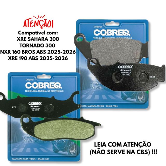 Pastilhas da melhor qualidade para frenagem da sua moto, testado e aprovado por laboratórios de qualidade! Não vai te deixar sem freio! Compatível com HONDA: XR 300 TORNADO 2024 XR 300 TORNADO 2025 XRE 300 SAHARA 2024 (ABS) XRE 300 SAHARA 2025 (ABS) XRE 300 SAHARA 2026 (ABS) NXR 160 BROS 2025 (ABS) NXR 160 BROS 2026 (ABS) ** ATENÇÃO ** NÃO SERVE NA BROS 160 COMBI BRAKE (CBS) XRE 190 2025 XRE 190 2026 Conteúdo da Embalagem: 01 Par de Pastilhas de Freio Dianteira Cobreq Street (orgânica) 01 Par de Pastilhas de Freio Traseira Cobreq Street (orgânica) Código Original (OEM) da Pastilha Dianteira: 06455-K43-911 Código Original (OEM) da Pastilha Traseira: 06435-KRE-G32 Especificações da Pastilha: - Ótima performance em condições secas ou molhadas - Bom poder de frenagem - Baixa dureza do material de atrito - Rápido assentamento inicial da superfície da pastilha à do disco de freio - Dissipação de calor moderada - Performance superior - Pastilha de alta duração - Maior segurança ao motociclista - Possui medidas originais - Tendência a redução de ruídos - Boa durabilidade As pastilhas de freio Cobreq são acessórios especificamente desenvolvidos para oferecer alta performance em frenagens. Importante !! Recomendamos que a instalação seja feita por profissional especializado e não nos responsabilizamos pelo mau uso do produto. Verifique, antes da compra, se as medidas das pastilhas são compatíveis com a da sua moto.
