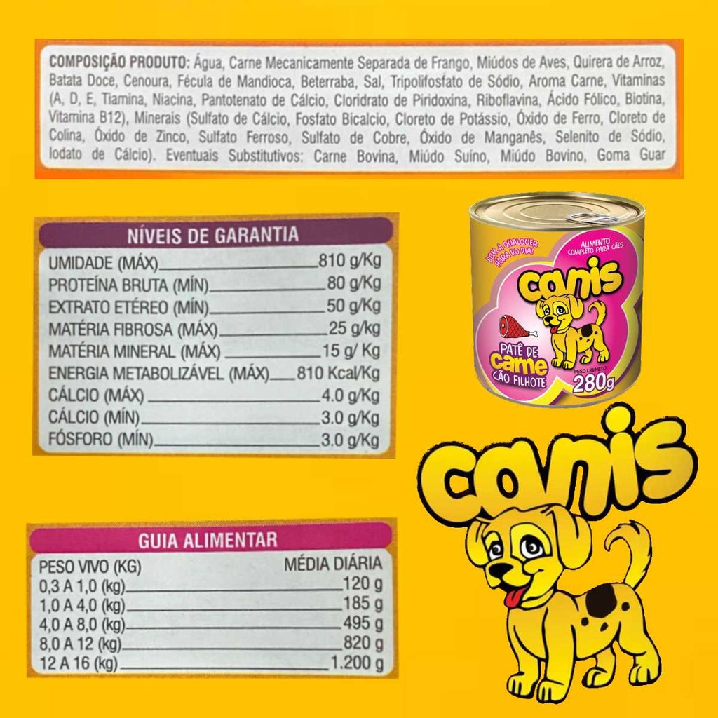 KIT COM 12 UNIDADES DA LATA SACHÊ PATÊ CANIS FILHOTE CARNE 280GR Descrição do Produto A lata de Sachê Canis para cachorro filhote é uma ração de alta qualidade, formulada para fornecer uma nutrição equilibrada e completa. Com sabor de carne, essa é ideal para satisfazer o apetite do seu pet. Benefícios - Nutrição Equilibrada: É formulada para fornecer uma nutrição equilibrada e completa. - Sabor Atraente: Tornando a refeição mais agradável. - Fácil de Digerir: Reduzindo o risco de problemas gastrointestinais. Características - Marca: Canis - Tamanho: 280gr - Sabor: Carne - Tipo: Ração para cachorro filhote - Formato: Lata Ingredientes - Proteínas: carne de boi e carne de frango - Carboidratos: Arroz, aveia - Vitaminas e Minerais: Vitaminas A, D, E, cálcio, fósforo Modo de Uso 1. Abra a lata e sirva a ração para o seu cachorro filhote. 2. Ajuste a quantidade de ração de acordo com a idade, tamanho e nível de atividade do seu cachorro. Precauções - Armazene a lata em um local fresco e seco. - Mantenha a lata fora do alcance das crianças e dos animais. - Se o seu cachorro tiver alguma alergia ou sensibilidade, consulte um veterinário antes de usar a ração. PRODUTO COM NOTA FISCAL? - Sim, trabalhamos somente com produtos originais e com nota fiscal. TODOS AS FOTOS SÃO REAIS DE NOSSOS PRODUTOS, QUALQUER DÚVIDA ESTAMOS À DISPOSIÇÃO