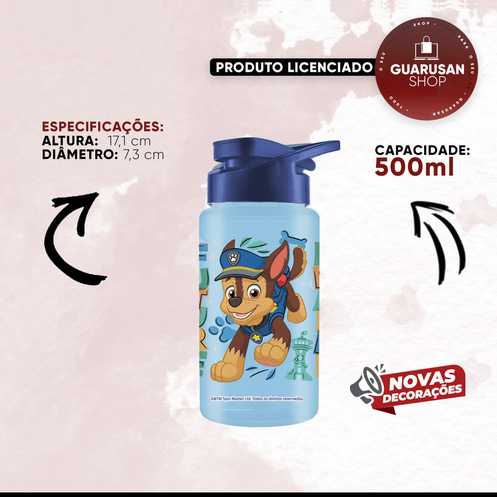 Kit Patrulha Canina Chase - Garrafa Squeeze Bottle Cantil Infantil Escolar 500ml (2 itens BPA Free)