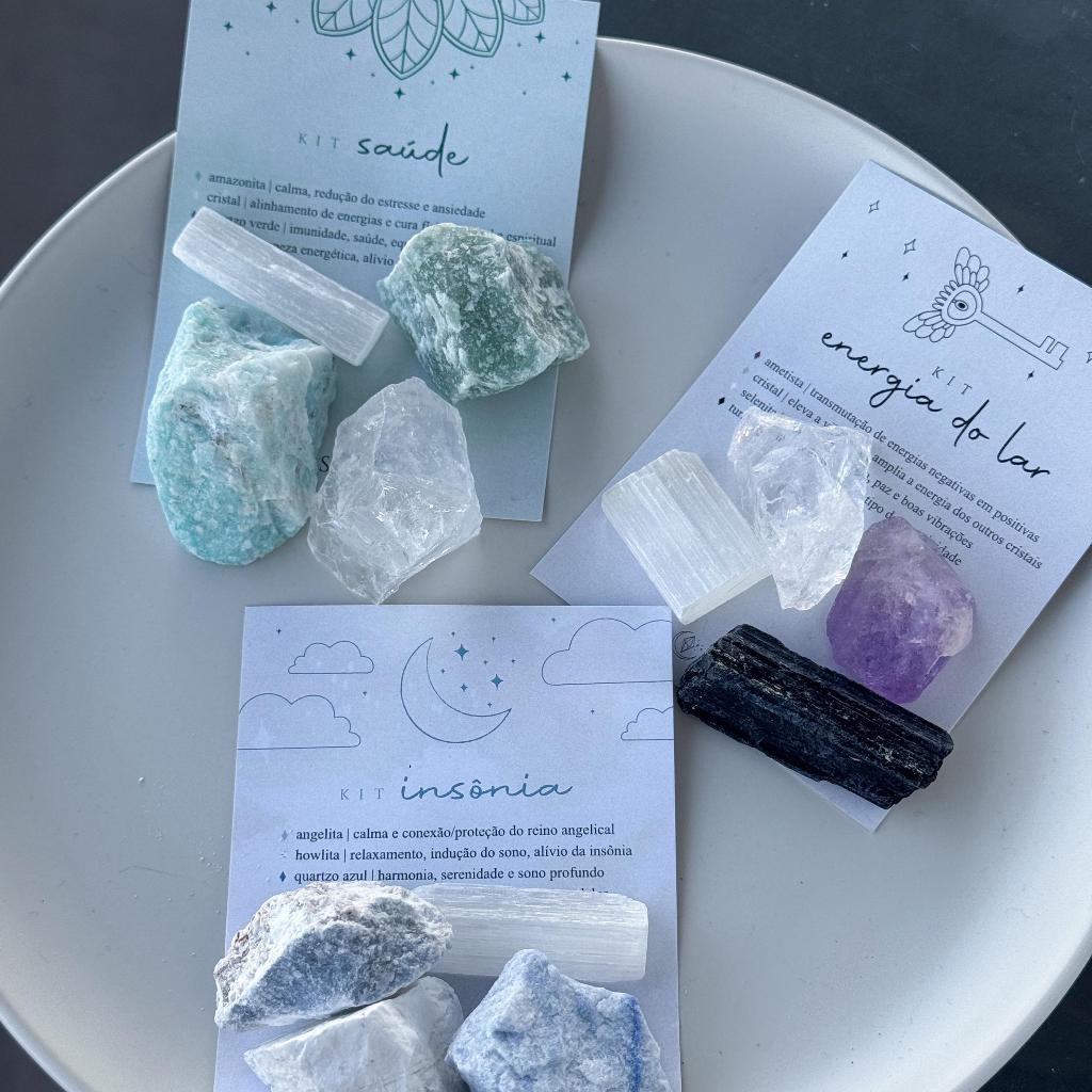 Kit composto por quatro pedras naturais. Tamanho aproximado de cada pedra: 2,5 cm. Ideal para utilizar em locais que fiquem próximos de você (bolsa, mesa de trabalho, decoração de casa, etc.). Selecione a opção desejada nas variações. Valor referente a 1 KIT COM 4 UNIDADES. Selecionando a opção "TODOS" você garante 1 kit de cada por um valor promocional. KIT ENERGIA DO LAR AMETISTA: transmutação de energias negativas em positivas. CRISTAL: eleva a vibração e amplia a energia dos outros cristais. SELENITA: limpeza energética, paz e boas vibrações. TURMALINA NEGRA: bloqueia qualquer tipo de negatividade. KIT AMOR JASPE VERMELHO: sexualidade, vitalidade e autoconfiança. QUARTZO ROSA: amor próprio, acolhimento e equilíbrio emocional. RODONITA: atração, compaixão, autoestima e cura emocional. SELENITA: limpeza energética, paz e boas vibrações. KIT SAÚDE AMAZONITA: calma, redução do estresse e ansiedade. CRISTAL: alinhamento de energias e cura física, mental e espiritual. QUARTZO VERDE: imunidade, saúde, equlíbrio e bem-estar. SELENITA: limpeza energética, paz e boas vibrações. KIT ÂNIMO CRISTAL: energia, bem-estar, brilho pessoal e limpeza energética. CALCITA LARANJA: ânimo, entusiasmo, disposição e criatividade. CALCITA AMARELA: alegria, positividade, movimento e realizações. JASPE VERMELHO: vitalidade, coragem, aterramento e proteção. KIT ANSIEDADE ÁGUA MARINHA: diminui pensamentos negativos e ansiedade. AMAZONITA: antiestresse, tranquilidade e compreensão. HOWLITA BRANCA: paciência, calma e serenidade. SELENITA: limpeza energética, paz e boas vibrações. KIT INSÔNIA ANGELITA: calma e conexão/proteção do reino angelical. HOWLITA BRANCA: relaxamento, indução do sono e alívio da insônia. QUARTZO AZUL: harmonia, serenidade e sono profundo. SELENITA: purificação, paz e afastamento de pesadelos. KIT ESTUDO E TRABALHO CALCITA LARANJA: criatividade, disposição, vitalidade e ânimo. FLUORITA: organização, absorção de conhecimento e raciocínio. OLHO DE TIGRE: determinação, coragem e alcance de metas. SODALITA: foco, concentração, clareza mental e autoconfiança. KIT CARRO HOWLITA BRANCA: paciência, calma e serenidade. SELENITA: limpeza energética e vibrações positivas. SODALITA: direcionamento, foco e autoconfiança. TURMALINA NEGRA: bloqueia e combate energias negativas. KIT INFANTIL CIANITA AZUL: proteção dos anjos e reduz o medo. QUARTZO ROSA: aconchego e equilíbrio emocional. QUARTZO VERDE: saúde, imunidade, cura e bem-estar. SELENITA: paz, sono tranquilo e longe de pesadelos. KIT PROSPERIDADE CALCITA AMARELA: movimento, realização e alegria. CRISTAL: energia, bem-estar e brilho pessoal. PIRITA: prosperidade, sucesso e novas oportunidades. SELENITA: limpeza energética, paz e boas vibrações. KIT PROTEÇÃO AMETISTA: transmutação de energias e intuição. OLHO DE TIGRE: contra inveja e mau olhado. TURMALINA NEGRA: bloqueia qualquer tipo de energia negativa. VASSOURA DE BRUXA: varre para longe a negatividade. ATENÇÃO: por se tratar de um cristal natural, pode ocorrer variação da tonalidade, tamanho e formato da pedra.