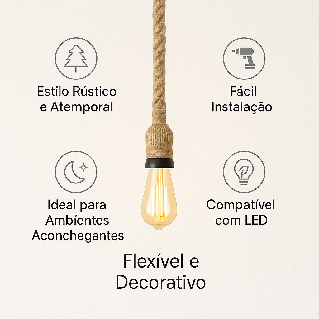A iluminação certa transforma o ambiente. Este pendente de corda é a escolha ideal para quem deseja unir simplicidade, aconchego e um toque artesanal. Sua estética rústica harmoniza com projetos modernos, retrô ou industriais. Com acabamento em corda trançada e estrutura flexível, o modelo se adapta facilmente a diversos cenários, oferecendo charme e versatilidade. ESPECIFICAÇÕES TÉCNICAS Soquete: E27 Voltagem: AC 85 a 265V Potência máxima: 40 watts Alturas disponíveis: 1m, 1,2m e 1,5m Grau de proteção: IP20 Material: Corda natural de 20mm Cuidados e limpeza Use pano seco ou levemente úmido. Evite umidade excessiva e áreas externas. Aplicações indicadas Ideal para uso sobre bancadas, mesas, cantinhos de leitura ou áreas gourmet internas. Perguntas frequentes É compatível com dimmer? Sim, desde que a lâmpada seja dimerizável. Posso usar mais de um pendente em conjunto? Sim, a instalação múltipla valoriza ainda mais o efeito decorativo. A instalação é complexa? Não, é simples e pode ser feita com suporte de eletricista.