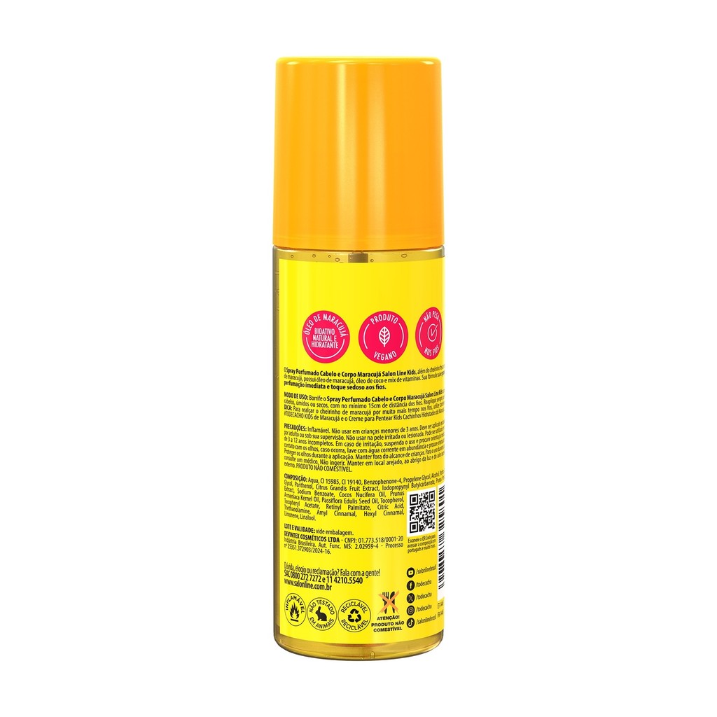 O Kit contém 1 Spray Perfumado Cabelo & Corpo Melancia Salon Line KIDS 200ml e 1 Spray Cabelo & Corpo Maracujá Salon Line Kids 200ml. A combinação imediata e incrível para o corpo e o cabelo. É dermatologicamente testado. <>INDICAÇÕES$& Para quais tipos de cabelo? Todos. Qual a indicação? Sem brilho. Pode usar a partir de quantos anos? A partir de 03 anos. <>ATIVOS$& Quais os principais ativos? Spray Perfumado Cabelo & Corpo Melancia Kids Com cheirinho maravilhoso de melancia, possui óleo de semente de melancia, mix de vitaminas e glicerina vegetal. Sua fórmula suave proporciona brilho aos cabelos sem pesar e perfumação imediata. Spray Perfumado Cabelo & Corpo Maracujá Kids Além do cheirinho fresco de maracujá, possui extrato de frutas amarelas, óleo de coco e mix de vitaminas. Sua fórmula suave não deixa os fios pesados, proporciona brilho e oferece uma fragrância que dura o dia todo. <>MODO DE USO$& Qual a melhor forma de usar? Borrife o Spray na pele e nos cabelos, úmidos ou secos, mantendo uma distância mínima de 15 cm. Reaplique sempre que desejar. DICA: Para intensificar o aroma por muito mais tempo nos cabelos, utilize também os cremes Creme para Pentear Kids Cachinhos Definidos de Melancia e Creme para Pentear Maracujá Kids Cachinhos Hidratados <>CARACTERÍSTICAS$& É produto vegano? Os produtos são veganos. É liberado? Os produtos não são liberados.
