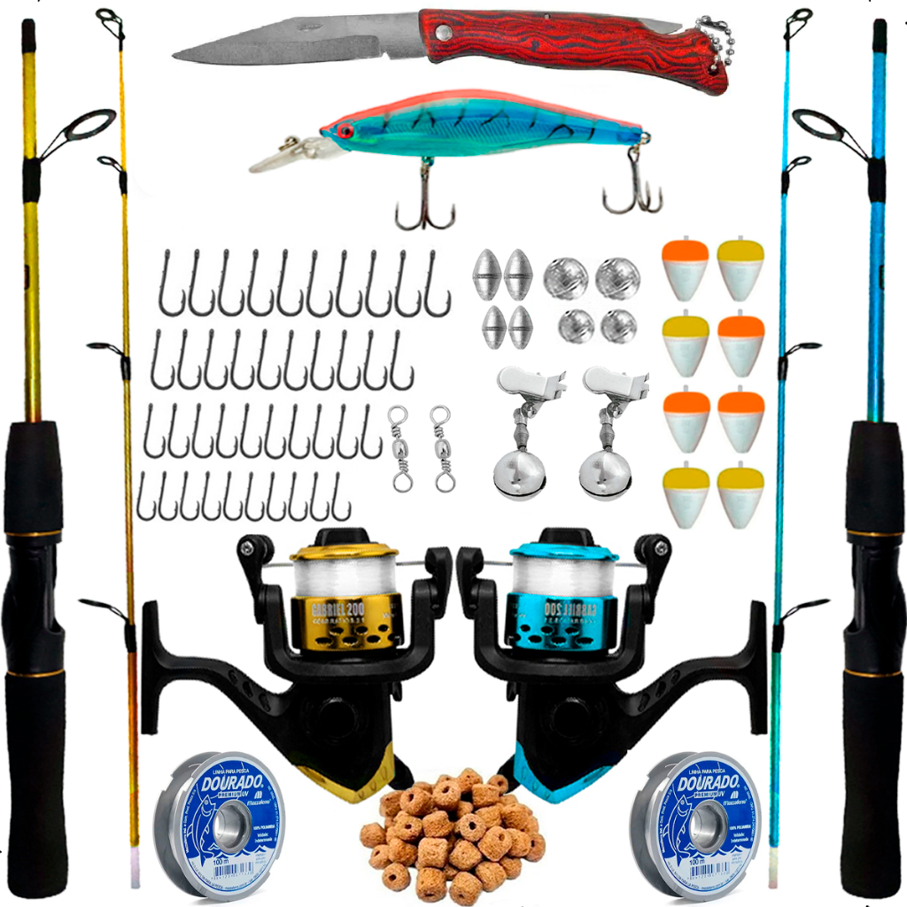 2 Varas para Molinete 1,20m suporta 10kgFibra de Vidro cabo em EVA, passadores em cerâmica, em duas partes, medindo 64 cm cada uma, cor conforme disponibilidade em estoque; 2 Molinetes Toto 200, BH200 Jimmy ou Sol da Marine Sports com 1 rolamento, sistema balanceado, relação de recolhimento 5.2:1, carretel em plástico, super leve e macio para uso. Capacidade de linha 0,18mm 245m 0,20mm 200m 0,25mm 125m 2 Linhas Monofilamento 0,25mm (já enrolada no molinete) Anzol 4330 Super Strong Marine Sports Niquelado Nickel, pois possui farpas muito eficiente que auxilia na fisgada do peixe. 10 Anzol 4330 Nº1 (3,1 cm) 10 Anzol 4330 Nº4 (2,5 cm) 10 Anzol 4330 Nº6 (2,0 cm) 10 Anzol 4330 Nº8 (1,8cm) 10 Anzol 4330 Nº10 (1,5 cm) Chumbo bolinha, utilizado para pesca de fundo. 2 Chumbo Bolinha 2gr 2 Chumbo Bolinha 6gr 2 Chumbo Oliva 8gr 2 Chumbo Oliva 15gr Boia em isopor colorida, possui um bastão de plastico para a passagem da linha. 2 Boia nº2 2 Boia nº4 2 Boia nº5 2 Boia nº6 2 Giradores simples em aço carbono nº7, Utilizado para evitar torção da linha. 2 Sinete/Guizo de Espera utilizado em varas para deixar em espera aguardando o peixe puxar. 1 Pacote com isca furadinha 100 gramas 1 Isca Artificial meia agua cor conforme disponibilidade em estoque 1 canivete Imagens Ilustrativas