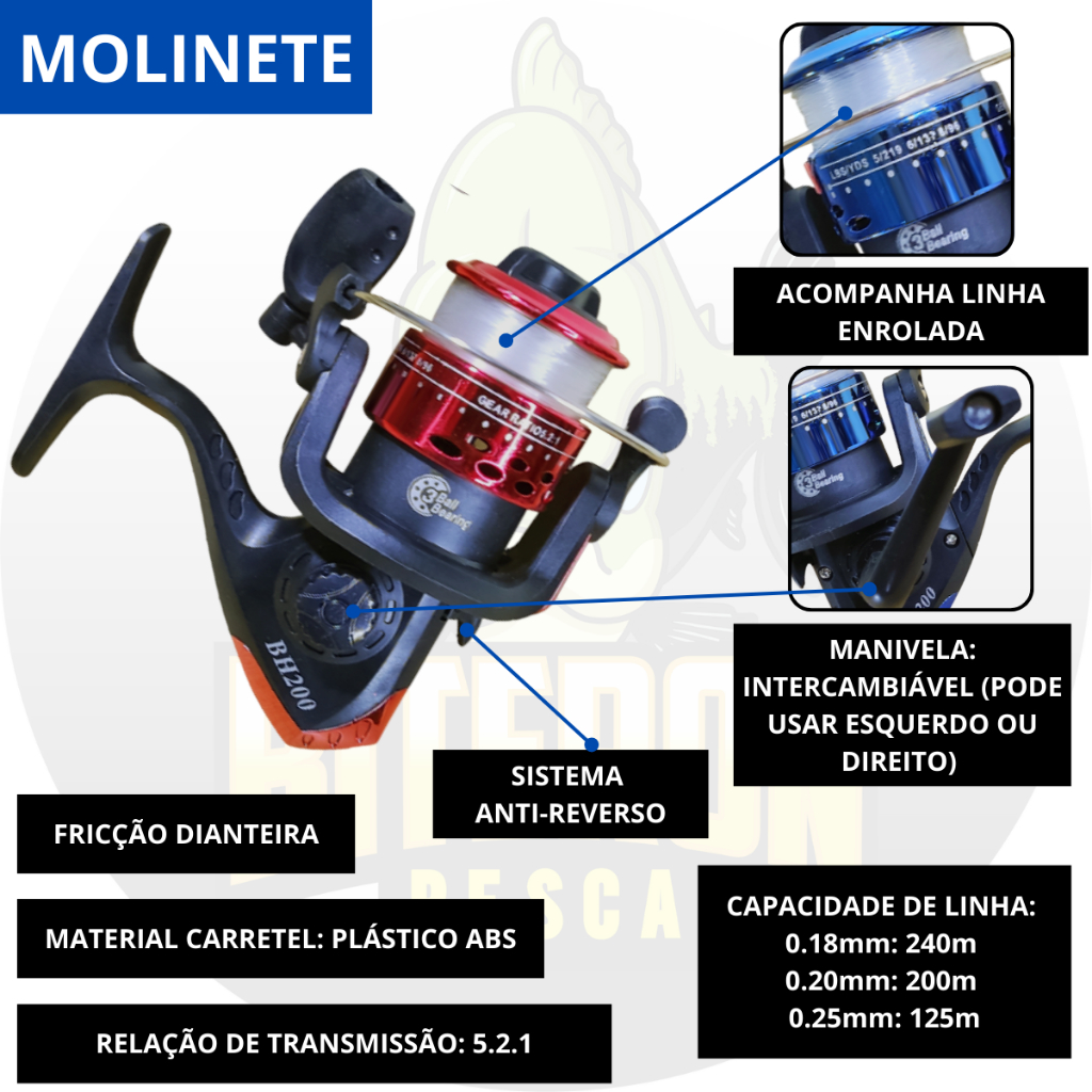 Kit de pesca composto por: - 1 vara telescópica 1,7m - 1 molinete BH200 - 1 maleta - 6 bóias (2x n3, 2x n4, 2x n5) - 6 Chumbadas oliva (2x 5g, 2x 8g, 2x 10g) - 6 anzóis Albatroz 4330 (2x 1, 2x 2/0, 2x 4) - 2 girador - 1 Isca artificial (conforme disponibilidade de estoque) - 1 Sino - 1 Canivete Utilização: - Equipamento leve - Pescarias leves - Pescaria indicada: rios, lagos, pesqueiro - Peixes indicados: até 3 kg (traira, tucunare, tilapia, pacu, tambaqui, matrinxa, piau, piapara, pintado) Vara De Pesca para Molinete Telescopica De 1,70m 20lbs Especificações: - Modelo: Vara telescópica - Tamanho: 1,7m - Cabo: 27 cm- Peso: 105 gramas - Material: Fibra de Vidro - Resistência: 12 - 20 Libras - Passadores: 3 + 1 Ponteira - Comprimento Fechada: 45 cm - Base do Molinete: Alumínio e Plástico **CORES ENVIADAS ALEATÓRIA CONFORME DISPONIBILIDADE DE ESTOQUE (VERDE, AZUL, AMARELO, VERMELHO) Molinete BH200 Especificações: - Modelo: BH200 - Material do carretel: Plastico ABS - Material do corpo e manivela: Plastico ABS - Velocidade de recolhimento: 5.2:1 - Drag: 3kg - Rolamentos: 3 Rolamentos - Tamanho: 11cm (altura) - Friccao: Dianteira de ponto a ponto - Manivela: Intercambiável (Direito ou Esquerdo) - Sistema anti-reverso: Sim - Sistema de rotor balanceado: Sim - Capacidade de Linha: 0,18mm 245m / 0,20mm 200m / 0,25mm 125m - Peso: 140 gramas - Acompanha Linha - Cor: aleatório conforme disponibilidade de estoque (azul, vermelho, branco, verde, amarelo) **CORES ENVIADAS ALEATÓRIA CONFORME DISPONIBILIDADE DE ESTOQUE (AZUL, VERMELHO, BRANCO, VERDE, AMARELO) Maleta Combat 5060 Organizadora Multiuso Especificações: - Fabricante: Arqplast - Modelo: Combat 5060 - Material: Plástico - Dimensões: Altura: 8cm x Largura: 30cm x Profundidade: 14cm - Aberta Altura: 16cm - Cor: Preto e Laranja - Peso: Aprox. 180g