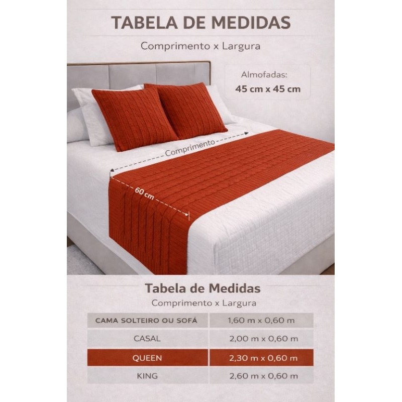 COMPRA SEGURA! ENVIO IMEDIATO! kit Peseira Manta Trança Tricô sofá Cama Solteiro Casal Queen King + 2 Capas de Almofada, Cama Posta Renove sua decoração com este conjunto em tricô de alta qualidade, que une elegância, conforto e sofisticação. A trama em trança traz textura e charme, valorizando a cama ou o sofá com um visual aconchegante e moderno. Dimensões do Produto: Manta para sofá ou cama de solteiro: 1,60m x 0,60m; Capas de almofada: 45cm x 45cm (2 unidades). Cama casal: 2,00m x 0,60m; Capas de almofada: 45cm x 45cm (2 unidades). Cama Queem: 2,30m x 0,60m; Capas de almofada: 45cm x 45cm (2 unidades). Cama king: 2,60m x 0,60m; Capas de almofada: 45cm x 45cm (2 unidades). OBS: As Capas são do tipo envelope sem enchimento. 🧶 Tricô encorpado e macio ✔ Acabamento refinado ✔ Design elegante e atemporal ✔ Ideal para quarto ou sala 📦 Contém: • 1 Peseira • 2 Capas de almofada As medidas podem apresentar variação de até 2%, por se tratar de um produto têxtil confeccionado em tricô. Perfeito para quem busca estilo, conforto e um toque decorativo diferenciado.