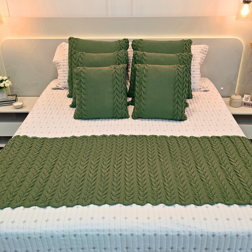 Kit Peseira Manta Tricot Sofá Cama Casal Queen King Aconchego Home Decor + 4 Capas Almofadas (2 de 50x50 e 2 de 60x60)