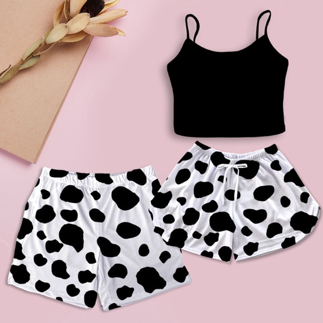 Kit Pijama de Casal Amor Para Dormir Cropped Preto Estampa Vaca + Shorts Samba Canção