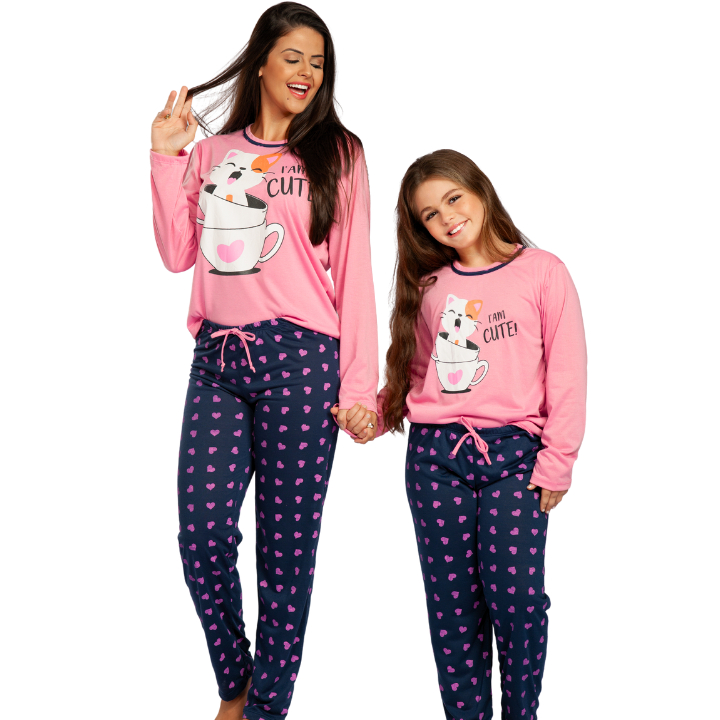 Kit Pijama Mãe e Filha Inverno Conjunto Adulto e Infantil Calça e Blusa de Frio Gato Xícara