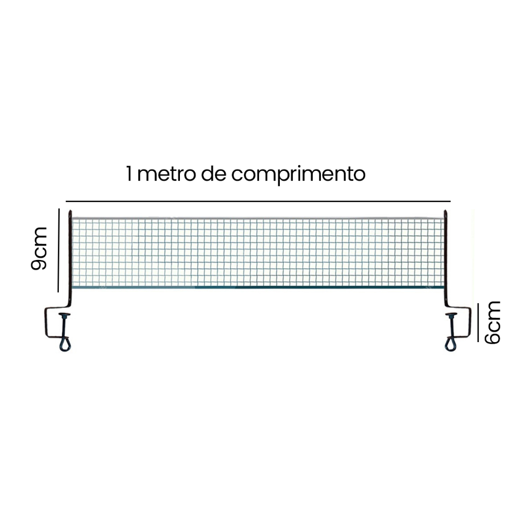 🎉 Kit de Ping Pong Portátil 🏓 O kit Ping Pong é perfeito para momentos de diversão com família e amigos, ideal para festas, viagens e momentos de descontração! Ele é desmontável, compacto e super fácil de transportar. Além disso, a prática do ping pong ajuda a melhorar tempo de reação, concentração, memória e coordenação motora das crianças 👧🧒✨ 📦 ITENS INCLUSOS 🔹 01 rede com 2 suportes 🔹 02 raquetes 🏓 🔹 03 bolinhas ⚪⚪⚪ 📏 DIMENSÕES 📌 Altura do suporte que prende na mesa: aprox. 6 cm 📌 Altura da rede: aprox. 9 cm 📌 Comprimento da rede: 1 metro