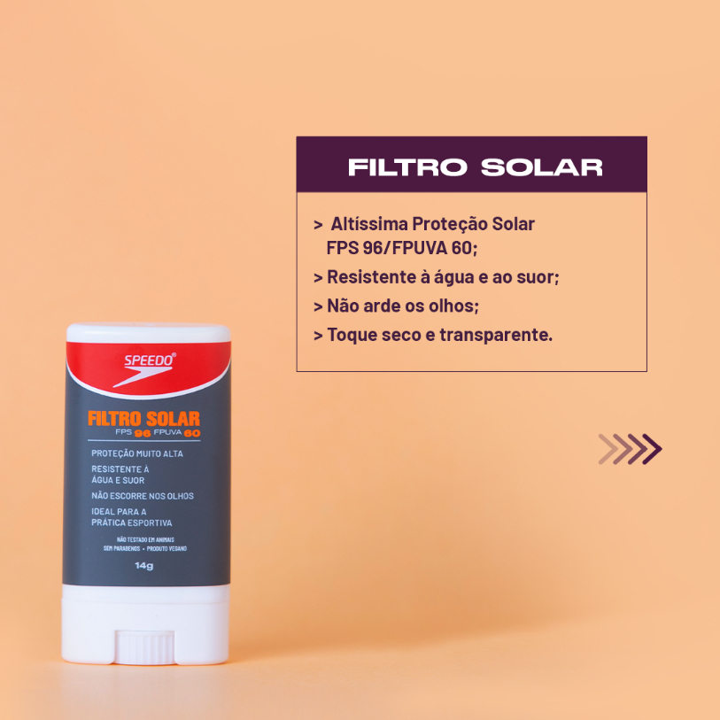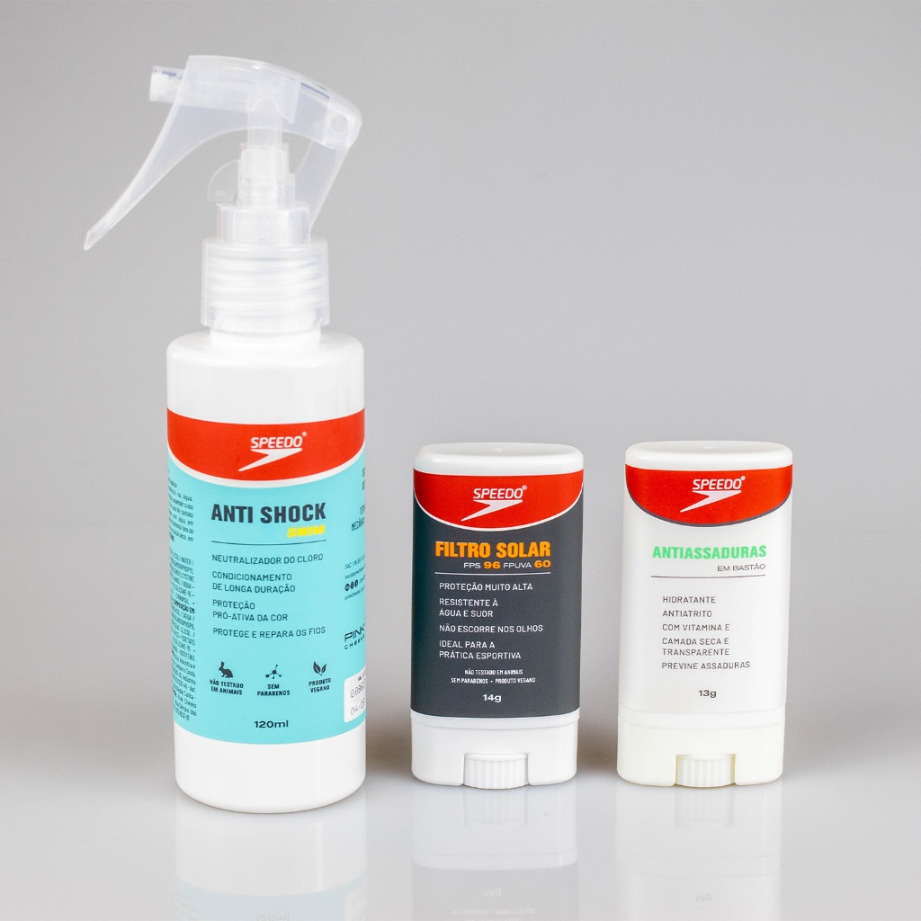 Neste Kit contém: Leave-in Spray Anti Shock Swim Speedo 120ml O leave-in ideal para proteger seus cabelos na hora da natação. Sua fórmula atua formando uma barreira de proteção contra os danos causados pela água do mar, da piscina. Protegendo também contra os raios UVA e UVBl! Neutraliza a ação do cloro e proporciona hidratação e condicionamento de longa duração aos fios. Seus cabelos mais hidratados, mesmo depois de horas em contato com cloro, sal e suor! Protetor Solar Facial FPS96 e FPUVA60 Speedo 14g Desenvolvido para proteger a pele durante a prática esportiva. Com altíssima proteção solar, FPS96 e FPUVA60, acima do exigido por lei, sua proteção evita as queimaduras e as manchas solares. Além disso, tem toque seco, não escorre e não arde nos olhos, garantindo proteção e conforto durante a prática esportiva. Rico em vitamina E, é hipoalergênico e dermatologicamente testado, o que garante a segurança do uso, sem riscos de alergias ou irritações. O produto possui resistência comprovada em laboratórios credenciados de 2 horas de submersão na água, sem perder seu fator de proteção original. Antiatrito em Bastão Speedo 13g Proteção da pele contra agressões externas, prevenindo assaduras. Fórmula rica em Vitamina E de ação hidratante. Atua formando uma camada transparente e seca na área aplicada, que garante conforto durante a atividade física. Rápida absorção. Seu formato em bastão é prático, facilitando a aplicação e reaplicação.
