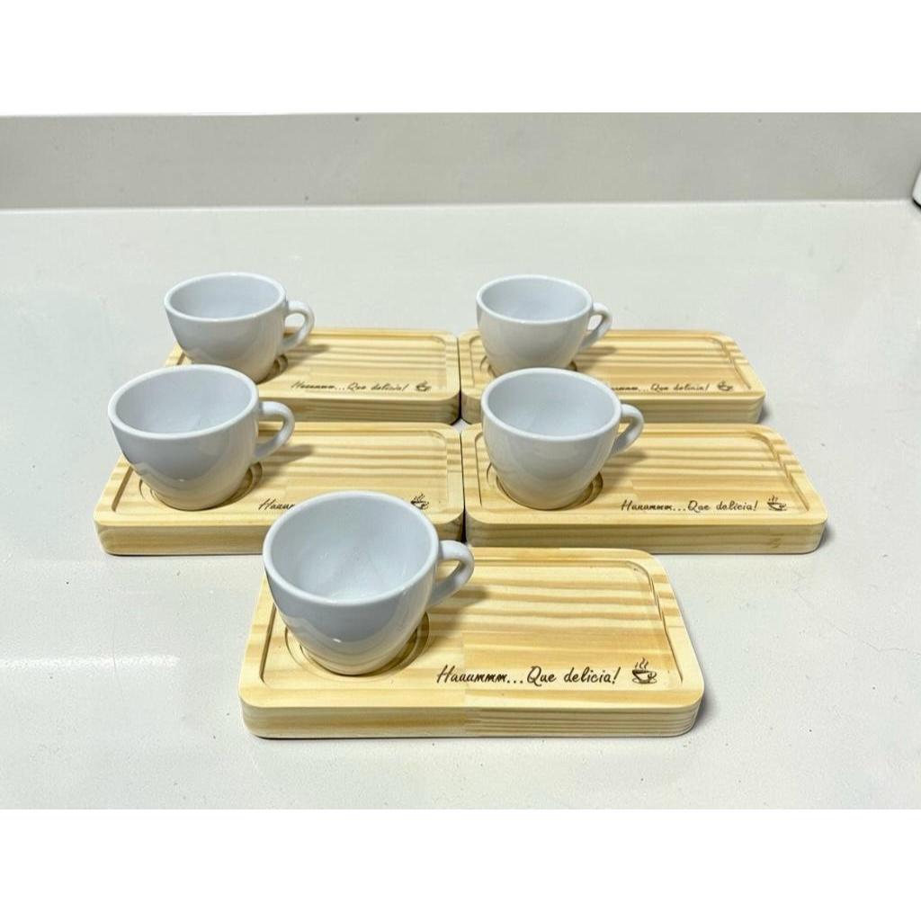 Kit Pires de Madeira Pinus Retangular Personalizado 18x9cm + Xícaras de Porcelana de 57 ml