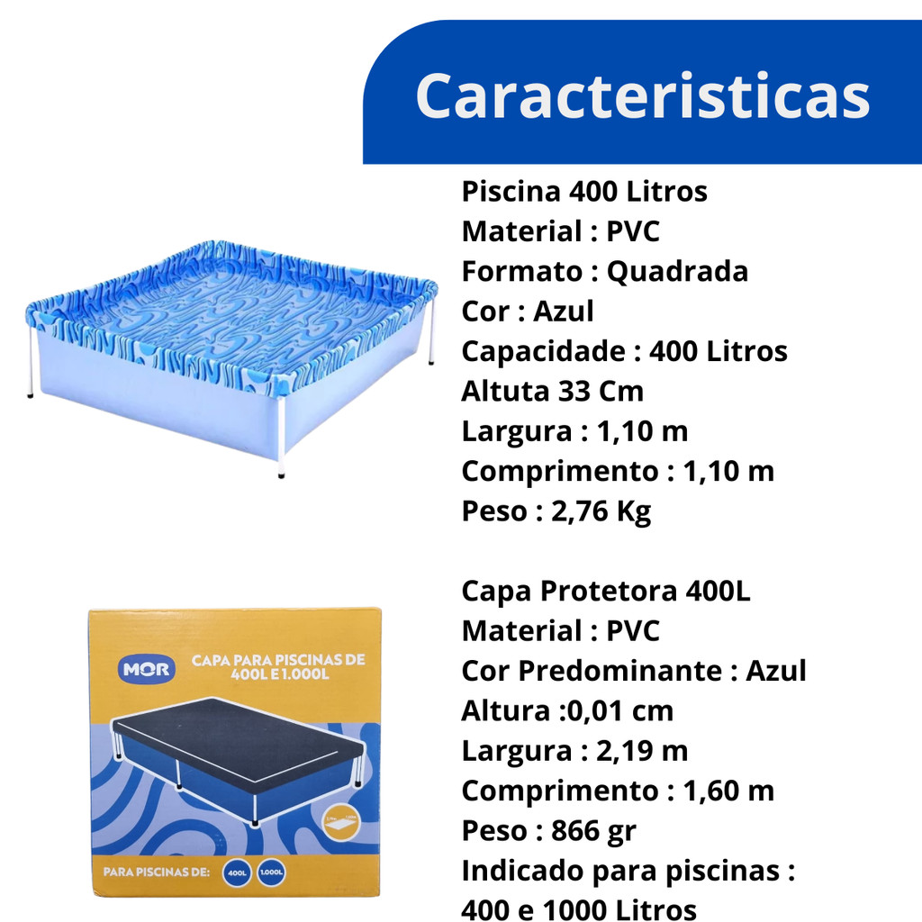 PISCINA 400 LITROS + CAPA DE PROTEÇAO MOR PRODUTO ORIGINAL A PRONTA ENTREGA Os pequenos vão adorar essa piscina! Com capacidade para 400 litros, ela é prática de ser transportada e montada em qualquer lugar, excelente para quem tem pouco espaço em casa. Fabricada com lona resistente com estampa em ondas e estrutura firme, proporciona segurança e garante momentos de alegria nos dias de calor. Constituída de estrutura em aço com acabamento em pintura epóxi à pó branca, a piscina 400 litros da Mor possui peças plásticas em polipropileno com sistema de encaixe, que facilitam a montagem. Atenção! A lona em PVC é leve e resistente, mas a piscina não deve ser transportada com água em seu interior. Proteja sempre o piso para evitar objetos pontiagudos que possam perfurar o material. Agora é só curtir os melhores momentos do verão ao lado da criançada! Atenção! Nunca deixe crianças sozinhas perto da água sem supervisão de um adulto. CARACTERÍSTICA DO PRODUTO: Material: Estrutura: Metalica, Lona: PVC, Peças: Plástica Formato: Quadrada Capacidade: 400 Litros DIMENSÕES DO PRODUTO: Altura: 33,00 Cm Largura: 1,10 M Comprimento: 1,10 M CAPA PARA PISCINA 400L E 1000 LITROS MOR Mantenha sua piscina sempre limpa com a Capa Piscina Infantil! Ela é perfeita para proteger contra insetos parasitas, água da chuva, folhas e sujeiras em geral, conservando a água da piscina própria para banho por muito mais tempo, ajudando assim o meio ambiente.Produzida em PVC, a Capa possui cordas em poliéster para serem fixadas na estrutura da Piscina Infantil de 400 e 1.000 litros. CARACTERÍSTICAS DO PRODUTO: Tipo de Material: PVC Cor: Azul Indicada para Piscina de 400 litros E 1000 litros DIMENSÕES DO PRODUTO: Altura: 1 cm Largura: 1,60 m Comprimento: 2,19 m Peso: 866g