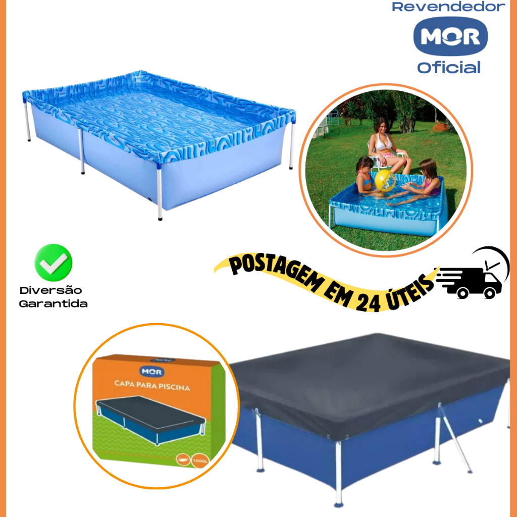 KIT PISCINA 1000 LITROS + CAPA PROTETORA MOR PRODUTO ORIGINAL E A PRONTA ENTREGA As piscinas da Linha Infantil da Mor foram desenvolvidas pensando no bem-estar e na diversão das crianças. Com estrutura fabricada em aço com acabamento em pintura epóxi, a Piscina 1.000 litros possui peças plásticas em polipropileno com sistema de encaixe que facilitam sua montagem. Sua lona em PVC com estampas aquáticas convida as crianças a brincarem durante horas seguidas. Então, não se esqueça de passar o filtro solar em seus pequenos! Nesse momento os guarda-sóis podem ser grandes aliados para garantir sombra e tranquilidade aos momentos de diversão! Atenção! Nunca deixe crianças sozinhas perto da água sem supervisão de um adulto. CARACTERÍSTICA DO PRODUTO: Material: PVC Formato: Retangular Cor: Azul DIMENSÕES DO PRODUTO: Capacidade: 1.000 Litros Altura: 42,00 Cm Largura: 1,26 M Comprimento: 1,89 M Peso: 5,60 Kg DESCRIÇÃO DA CAPA: Mantenha sua piscina sempre limpa com a Capa Piscina Infantil! Ela é perfeita para proteger contra insetos parasitas, água da chuva, folhas e sujeiras em geral, conservando a água da piscina própria para banho por muito mais tempo, ajudando assim o meio ambiente.Produzida em PVC, a capa possui cordas em poliéster para serem fixadas na estrutura da Piscina Infantil de 1.000 litros. Lembrando que, além da Capa, é indispensável fazer o tratamento químico recomendado para a capacidade de água da sua piscina de acordo com seu Manual! CARACTERÍSTICA DO PRODUTO: Material: PVC Formato: Retangular Cor: Azul DIMENSÕES DO PRODUTO: Capacidade: 1.000 Litros Altura: 0,01 Centímetro Largura: 1,60 Metros Comprimento: 2,19 Metros Peso: 783,00 Gramas