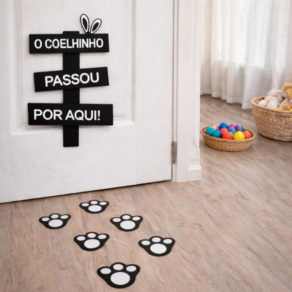 Caça aos Ovos de Páscoa em MDF – Kit Decorativo Coelhinho Passou Por Aqui Transforme a Páscoa em um momento mágico e inesquecível com este lindo kit de Caça aos Ovos em MDF! Com placa decorativa “O Coelhinho Passou Por Aqui” e patinhas de coelho para criar o caminho da brincadeira, o conjunto é perfeito para estimular a imaginação das crianças e deixar a casa ainda mais charmosa na Páscoa. Produzido em MDF de alta qualidade, com pintura preta e escrita branca, possui acabamento moderno, resistente e pronto para uso. Ideal para ambientes internos como sala, corredor, quartos e entrada da casa. Crie uma experiência divertida, interativa e cheia de memórias especiais para a família!