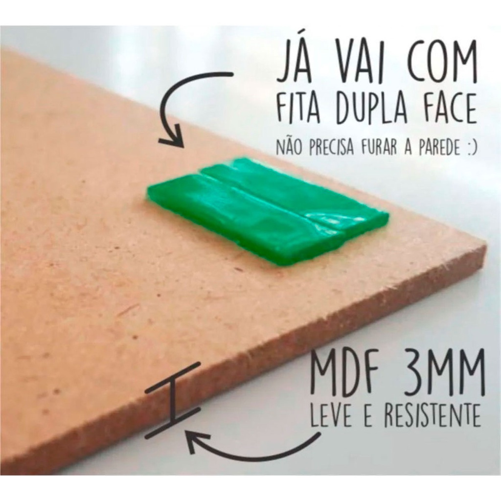 Nossas placas são desenvolvidas minunciosamente através de adesivos impressos em alta resolução, aplicados direto no material. O material das placas decorativas, são fabricados em madeira MDF de 3mm de lamina madeirada dando um fino acabamento. Artes com frases e imagens super criativas que vão deixar seu ambiente muito mais bonito, estiloso e divertido. Dimensões de cada peça: - Cada Peça tem 10x15 - Espessura: 3mm Tamanho total: 60cm (Largura) X 30cm (altura) Especificações Técnicas: - Não acompanha moldura! apenas impressão com bordas pretas. - Estrutura em MDF 3mm - Estampa impressa em adesivo com qualidade fotográfica de alta resistência; - Fita dupla face vhb 3M extra forte para fixação do quadro na parede - Todos os quadros acompanham manual de instalação. Tire todas suas dúvidas conosco, estamos sempre à disposição.