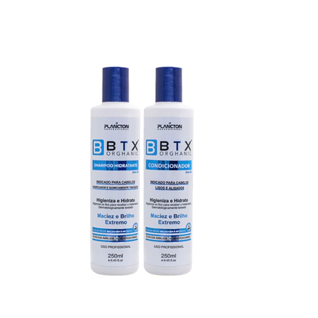 COMBO BTX ORGHANIC O Btx Orghanic foi Desenvolvido com altíssima tecnologia e formulado especialmente com matérias primas de qualidade, promove eliminação do frizz através do realinhamento térmico (a base de calor). Através de sua alta penetrabilidade no córtex, promove o encapsulamento dos fios com nutrição absoluta, aumento da elasticidade, brilho excepcional e poder antioxidante, hidratando e revitalizando a estrutura interna e externa do cabelo danificado, promovendo também a recuperação dos fios. Seus ativos sedimentam as cutículas proporcionado maciez, sedosidade e brilho intenso. O Shampoo Hidratante BTX ORGHANIC da Plancton Professional, foi desenvolvido para limpar e tratar os cabelos pré e pós aplicação do redutor de volume BTX ORGHANIC. Deixando uma sensação natural, prolongando o efeito do realinhamento. O Condicionador BTX ORGHANIC da Plancton Professional, foi desenvolvido para agir selando as cutículas, reduzindo a porosidade dos fios garantindo emoliência, brilho e maciez. A aplicação após o redutor de volumes BTX ORGHANIC deixa sensação natural e prolonga o efeito do realinhamento.