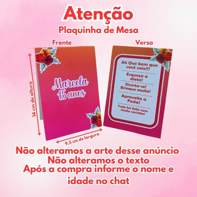 🚨 ATENÇÃO 🚨 ❣️Plaquinha de Mesa❣️ LEIA ATENTAMENTE ANTES DA COMPRA DÚVIDA PODE ESTÁ AQUI NA DESCRIÇÃO 👇🏽 -------------------------------------------------------------------- ⚠️ ATENÇÃO AO TAMANHO ⚠️ 15 cm de altura X 10 Cm de largura -------------------------------------------------------------------- ✅São plaquinhas para Mesa ✅As plaquinhas são feitas como a foto do anúncio ⛔São Totalmente impressos, não acompanha nenhum tipo de aplique e nem tag -------------------------------------------------------------------- ✅Imagem Real do produto -------------------------------------------------- ✅Feito em Papel Fotográfico Glossy ( Brilho ) 180 gramas -------------------------------------------------------------------- ✅Colocamos nome e idade ✅Após a compra informar em até 2 horas, ou o mesmo será enviado sem personalização -------------------------------------------------- ⛔NÃO ALTERAMOS A ARTE DO ANÚNCIO ⛔NÃO FAZEMOS TEMA NOVO ⛔NÃO FAZEMOS TROCA DE TEMA ⛔NÃO MANDAMOS A ARTE PARA APROVAÇÃO ⛔NÃO MANDAMOS FOTO ⛔NÃO TRABALHAMOS COM PEDIDOS DE URGÊNCIA ⛔SE SUA FESTA ESTÁ PRÓXIMO NÃO COMPRE -------------------------------------------------------------------- ⚠️IMPORTANTE 👇 🚨NÃO PEGUE COM AS MÃOS MOLHADA OU SUADA PARA NÃO DANIFICAR O PAPEL ⛔SE A SUA FESTA ESTIVER MUITO LONGE DA DATA ,TENHA CUIDADO, POIS SE TRATA DE UM PERSONALIZADO FEITO COM PAPEL FOTOGRÁFICO, SE FICAR MUITO TEMPO EXPOSTO A LUZ É EM LOCAL ÚMIDO PODE DESBOTAR DEIXE SEU PERSONALIZADO DENTRO DO SAQUINHO E EM LOCAL SECO -------------------------------------------------- 🚨ATENÇÃO 👇🏽 ✅VERIFICAR SE O PRAZO DE PRODUÇÃO E ENTREGA VAI CHEGAR A TEMPO ✅ANTES DE EFETUAR A COMPRA ATENÇÃO NA DATA ESTIMADA QUE A PLATAFORMA MOSTRA ✅APÓS A COMPRA INFORMAR NO CHAT O NOME E IDADE ⚠️VOCÊ TEM ATÉ 2 HORAS APÓS A COMPRA PARA MANDAR A INFORMAÇÃO ⚠️SE NÃO ENVIAR DENTRO DO PRAZO SEU PEDIDO SERÁ ENVIADO SEM PERSONALIZAÇÃO. -------------------------------------------------------------------- ⚠️FIQUE ATENTO AO PRAZO DE PRODUÇÃO E DE ENVIO NÃO SABEMOS INFORMAR SOBRE O DIA QUE SEU PEDIDO SERÁ ENTREGUE, POIS É RESPONSABILIDADE DA TRANSPORTADORA, E DENTRO DO SEU PEDIDO VAI ESTÁ A DATA DA SUA ENTREGA -------------------------------------------------------------------- 🚚FORMAS DE ENVIO: TODOS OS ENVIOS SÃO FEITOS PELA TRANSPORTADORAS DA SHOPEE ⛔NÃO TEMOS RESPONSABILIDADE COM ENTREGA E NEM COM ATRASOS -------------------------------------------------------------------- AINDA TEM ALGUMA DÚVIDA 💭 ENTRE NO CHAT E FALE COM A GENTE, ESTAMOS A DISPOSIÇÃO PARA TE ATENDER! 🚨LEIA A DESCRIÇÃO 🚨