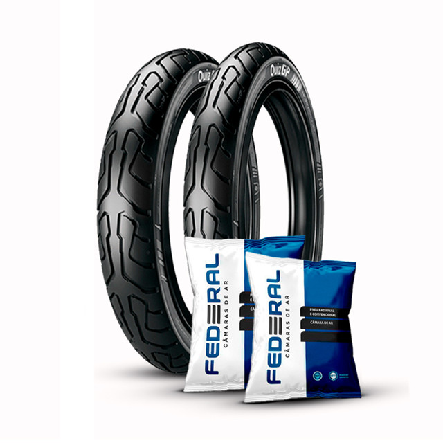 Kit Pneu Ira QzGp 80/100-14+60/100-17+ 2 Câmaras Biz 100/125 By Tortuga Sobre o Pneu: Pensado para quem ama mobilidade, o Ira Quiz GP é um pneu para moto que possui banda de rodagem com desenho otimizado para proporcionar mais aderência e durabilidade. Os ombros foram construídos para atuar com maior área de contato com o solo, o que aumenta o controle e a tração em curvas rápidas e fechadas. O Ira Quiz GP é um excelente pneu para moto em pista molhada, uma vez que os sulcos centrais drenam a água com maior eficiência e permite mudanças mais rápidas de direção em condições difíceis. Sobre a câmara Federal: As câmaras de ar Federal (By Tortuga), são desenvolvidas com matéria prima de alta qualidade, fabricado por especialistas, caracterizado por mais borracha, maior resistência, mais durabilidade uma alta resistência ao calor. Além disso, conta com o selo de certificação ISO 9001, uma referência internacional em qualidade, um diferencial da empresa. Informações Adicionais Dos Pneus: - Pneu Dianteiro Ira 60/100-17 M/c Tt Qzgp - Necessário uso de Câmara de Ar: Sim - Medida do Aro: 17 - Altura do Pneu: 100 - Largura do Pneu: 60 - Índice de peso: 33 - 115 kg , 33 - Índice de velocidade: L - 120 km/h , L - Pneu Ira 80/100-14 M/c Tt Qzgp Aro 14 - Necessário uso de Câmara de Ar: Sim - Medida do Aro: 14 - Altura do Pneu: 100 - Largura do Pneu: 80 - Limite de velocidade: 80/100-14: ‹ 120 km/h - Capacidade de carga: 80/100-14: ‹ 185 kg Informações Adicionais: - Medida: M 0417 - Modelo de válvula: TR 4 - Medida: M 0514 - Modelo de válvula: TR 4 Aplicação: - Honda: Biz 100 Todas, Biz 110 todas, Biz 125 Todas, Pop 100, Pop 110, C100 Dream - Kasinski: Win 110 - Traxx: Sky 50, Sky 125 - Shineray: Jet 125 O que você vai receber? - 1 Pneu Dianteiro Ira 60/100-17 M/c Tt Qzgp Dianteiro - 1 Pneu Ira Qzgp 80/100-14 M/c Tt - Biz 100/125 - Aro 14 Traseiro - 1 Câmara de Ar Federal Aro 17 TR4 Tortuga Cg Biz Pop 100 Dianteira - 1 Câmara de Ar Federal Aro 14 TR4 Biz 100/125 Pop 100 Traseiro “POR FAVOR, VERIFIQUE SEMPRE NO VEÍCULO QUAL É A MEDIDA EXATA DO SEU PNEU”