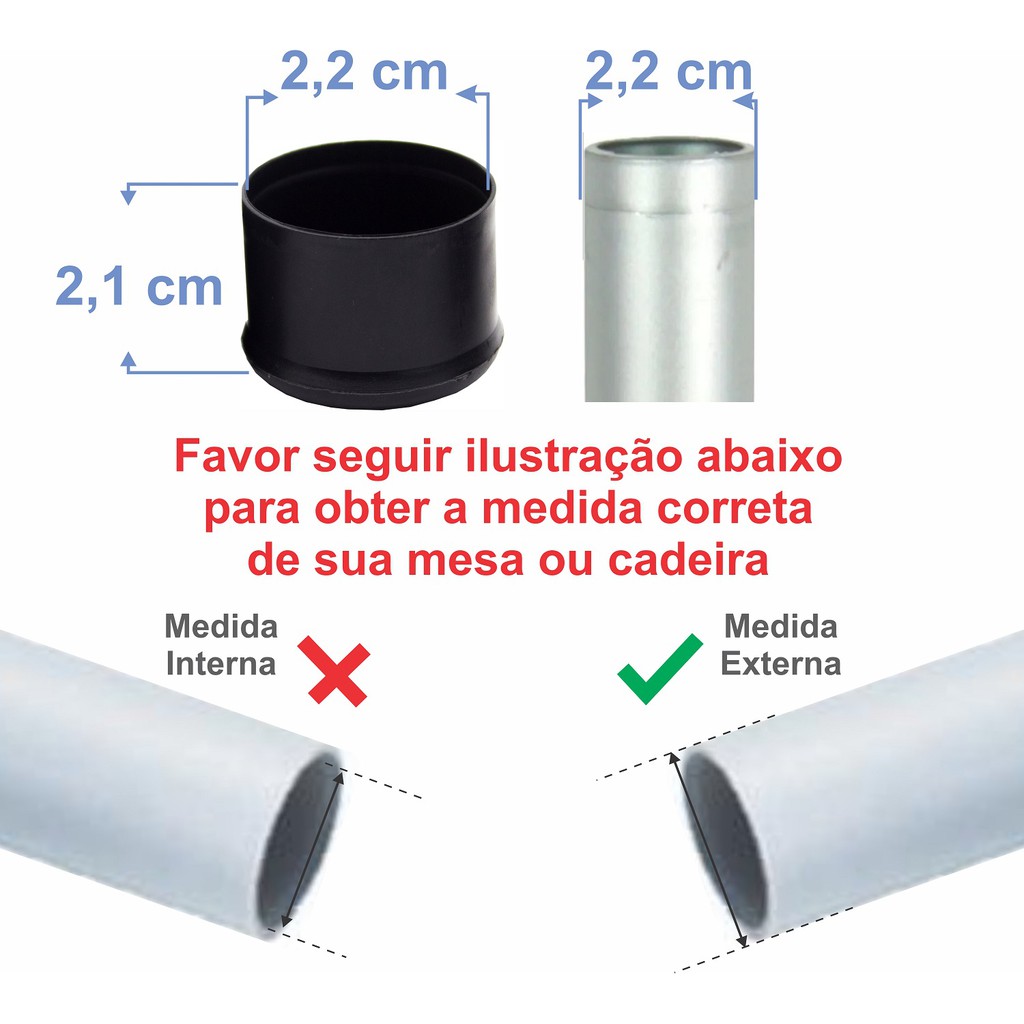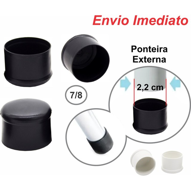 ****Temos o compromisso de garantir a satisfação total de nossos clientes.**** Fique tranquilo ao comprar com quem está disposto a oferecer o melhor atendimento pós venda pela nossa equipe através de um canal direto. --------------------------------------------------------------------------------------------------------------------- >>>> 24 Ponteiras Plásticas Protetoras Externa para Cadeiras ou Mesa <<<< Indispensável para uma maior proteção de sua Cadeira ou Mesa - Evita riscos no chão - Reduz o Barulho de Movimentação - Protege da Agua - Novo Visual para sua Cadeira ou Mesa - Borracha Flexível de Ótimo Acabamento - Fácil Instalação ----------------------------------------------------------------------------------------------------------------------- Características: Diâmetro: 2,2 cm (7/8") Altura: 2,1 cm Material: PVC Flexível Cor: Preto ----------------------------------------------------------------------------------------------------------------------- Contéudo da Embalagem: 24 Ponteiras para pés de mesa ou cadeira tubolar de 2,2cm (7/8") ----------------------------------------------------------------------------------------------------------------------- Obs: Fazer a medição correta conforme anuncio para uma compra satisfatória. -----------------------------------------------------------------------------------------------------------------------
