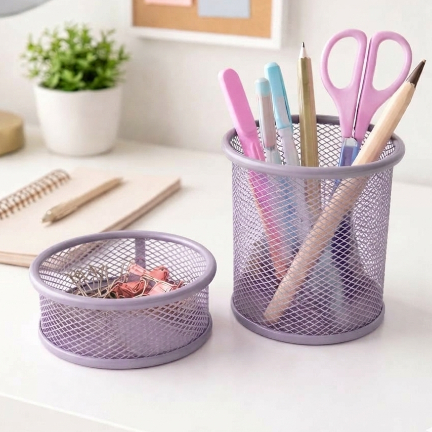 Kit Organizador Aramado – Elegância e Praticidade para sua Mesa Transforme sua rotina com um toque de organização e estilo. Este conjunto de organizadores aramados é ideal para deixar seu espaço mais funcional, bonito e harmonioso. O que acompanha o kit: • 1 Porta lápis/canetas • 1 Porta clips multiuso Diferenciais:• Metal de alta qualidade com pintura eletrostática (mais durável e resistente)• Design moderno em cores pastéis• Estrutura aramada que facilita a visualização dos itens• Fácil de limpar e resistente ao uso diário Medidas: • Porta clips: 9 cm de diâmetro x 4 cm de altura • Porta lápis: 9 x 9 x 9,5 cm (capacidade para 30 a 50 itens) Indicado para: • Escritório • Home office • Mesa de estudos • Organização de maquiagem, acessórios e outros itens Organize seu ambiente com praticidade e mantenha tudo ao alcance das mãos com um visual moderno e padronizado. Garanta o seu agora e transforme sua mesa hoje mesmo. Estoque limitado.