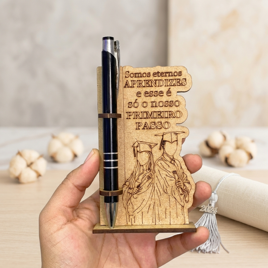 Porta-Caneta MDF "Eternos Aprendizes" Este porta-caneta em MDF é a combinação perfeita de funcionalidade e inspiração. Com um design único, ele traz a frase "Somos eternos aprendizes e esse é só o nosso primeiro passo", refletindo a importância da educação e do aprendizado contínuo. A arte delicada, que ilustra uma mulher de formatura segurando seu diploma, de costas para um amigo também formado, é uma representação simbólica da jornada do conhecimento e da parceria no crescimento. Este porta-caneta não é apenas um item funcional, mas também uma peça cheia de significado e motivação, ideal para quem valoriza o conhecimento e a busca incessante por novos aprendizados. MEDIDAS DO PRODUTO: 7 CM de cumprimento. 11 CM de altura. MATERIAL: MDF 3mm ------------------------------------ OBSERVAÇÕES: -Não acompanha caneta !! - A tonalidade da cor do produto pode variar de acordo com a resolução da tela - O produto é enviado desmontado para evitar danos durante o transporte e reduzir o custo do frete! - Montagem simples e de encaixe; (se achar necessário usar cola branca de boa qualidade, não acompanha) - Cuidados especiais: Não deixar em contato direto com a água, limpar somente com um pano levemente umedecido. ------------------------------------ SOMOS A MZKPLACE !! **** ARTE EM MDF, EXCLUSIVIDADE EM CADA DETALHE ****