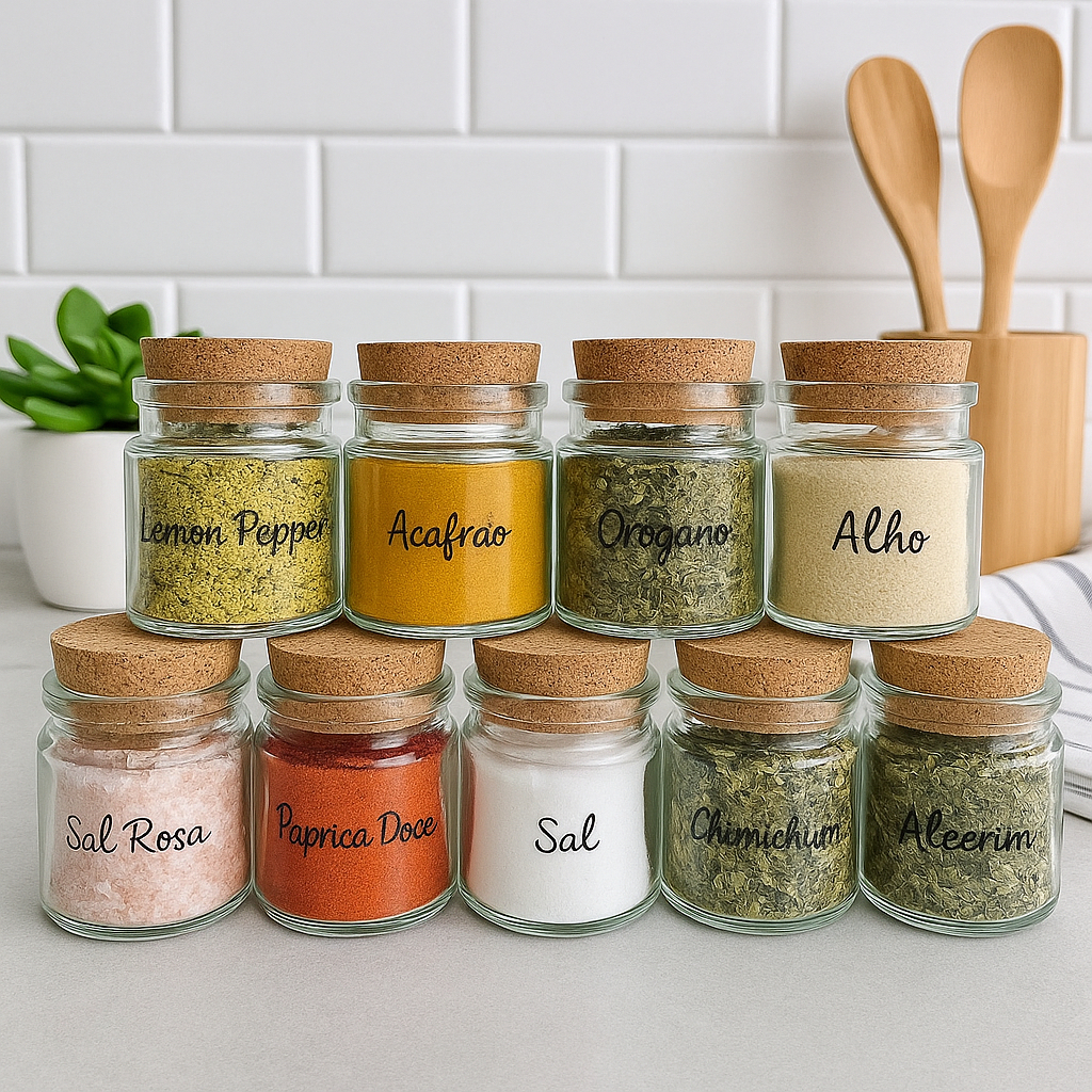 Kit Porta Temperos de Vidro Gourmet + 32 Etiquetas Temperos Potes Tampa Rolha Cozinha