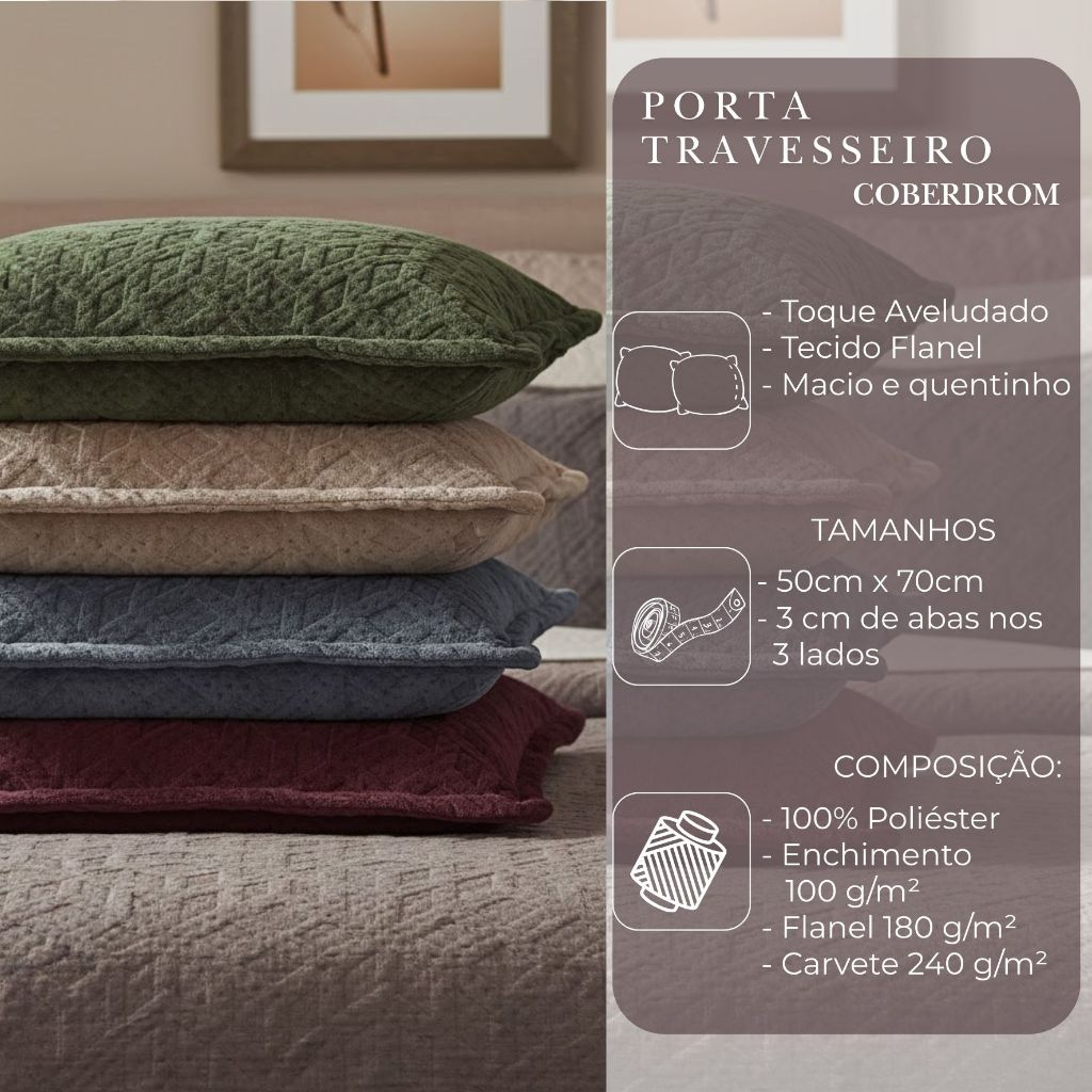 Transforme seu quarto em um refúgio de aconchego com o Porta Travesseiro Coberdrom Habitat. Desenvolvido para oferecer o máximo de conforto e um toque sofisticado. Toque Ultra Macio: Feito com 100% poliéster de alta qualidade, ele apresenta uma superfície de CARVETE e um verso em FLANEL de 180 g/m². Essa combinação proporciona uma sensação de maciez incomparável, ideal para suas horas de descanso, ele oferece um volume ideal que abraça seu travesseiro, proporcionando um suporte confortável e uma camada adicional de calor, como um coberdrom em miniatura. As abas de 3 cm em três lados adicionam um acabamento elegante e charmoso, emoldurando seu travesseiro e elevando a estética da sua cama. Durabilidade e Facilidade: A composição em 100% poliéster assegura a durabilidade do produto, além de ser fácil de lavar , este porta travesseiro é a combinação perfeita de funcionalidade e estilo. TAMANHO: - 50CM X 70CM - COM ABAS DE 3 CM NOS 3 LADOS COMPOSIÇÃO: - 100% POLIÉSTER - CARVETE 240 G/M² - ENCHIMENTO 100G/M² - FLANEL 180G/M²
